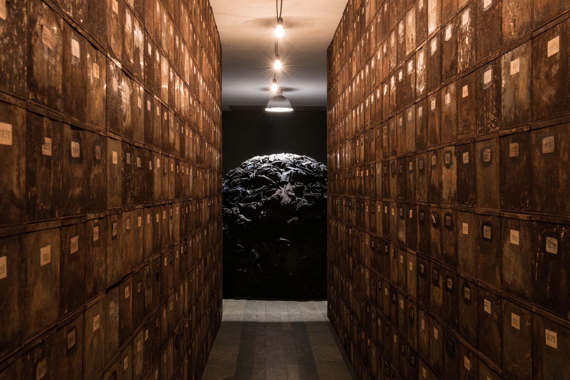 Christian Boltanski created for this exhibition Le Chemin de Babi Yar / The Path of Babi Yar (2016). Hundreds of metal boxes form a long and narrow corridor towards a monumental pile of dark clothes. The boxes, most of them numbered randomly, evoke a chilling relation to funeral urns of unknown persons. They bring to mind the process of killing in Babi Yar where victims brought their valuables and papers (mostly kept in small metal boxes). Once arrived at Babi Yar as an announcement of death, the papers were burned before their eyes.