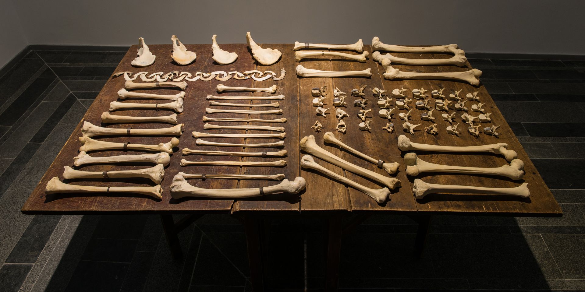 Lustmord Table, (1994) by Jenny Holzer, shows a group of human bones are lying on a wooden table. Some of them carry a silver band engraved with fragments of the text Lustmord. The text itself describes a rape-killing from three different points of view: the victim, the perpetrator and the observer. The work and text were conceived in response to the atrocities during the conflict in the ex-Yugoslavia. Combined with stone benches engraved with texts fragments from Under a Rock (1986), the act of killing itself and the use of violence as a political tool is central to the work. The bronze plaques with texts from the Living Series (1981) and Survival series (1984) ponder on the individual state of mind when confronted with acts of extreme violence. The plaques are combined with the Lustmord Table and Vanwege een Tere Huid III and IV (2016) byBerlinde De Bruyckere.