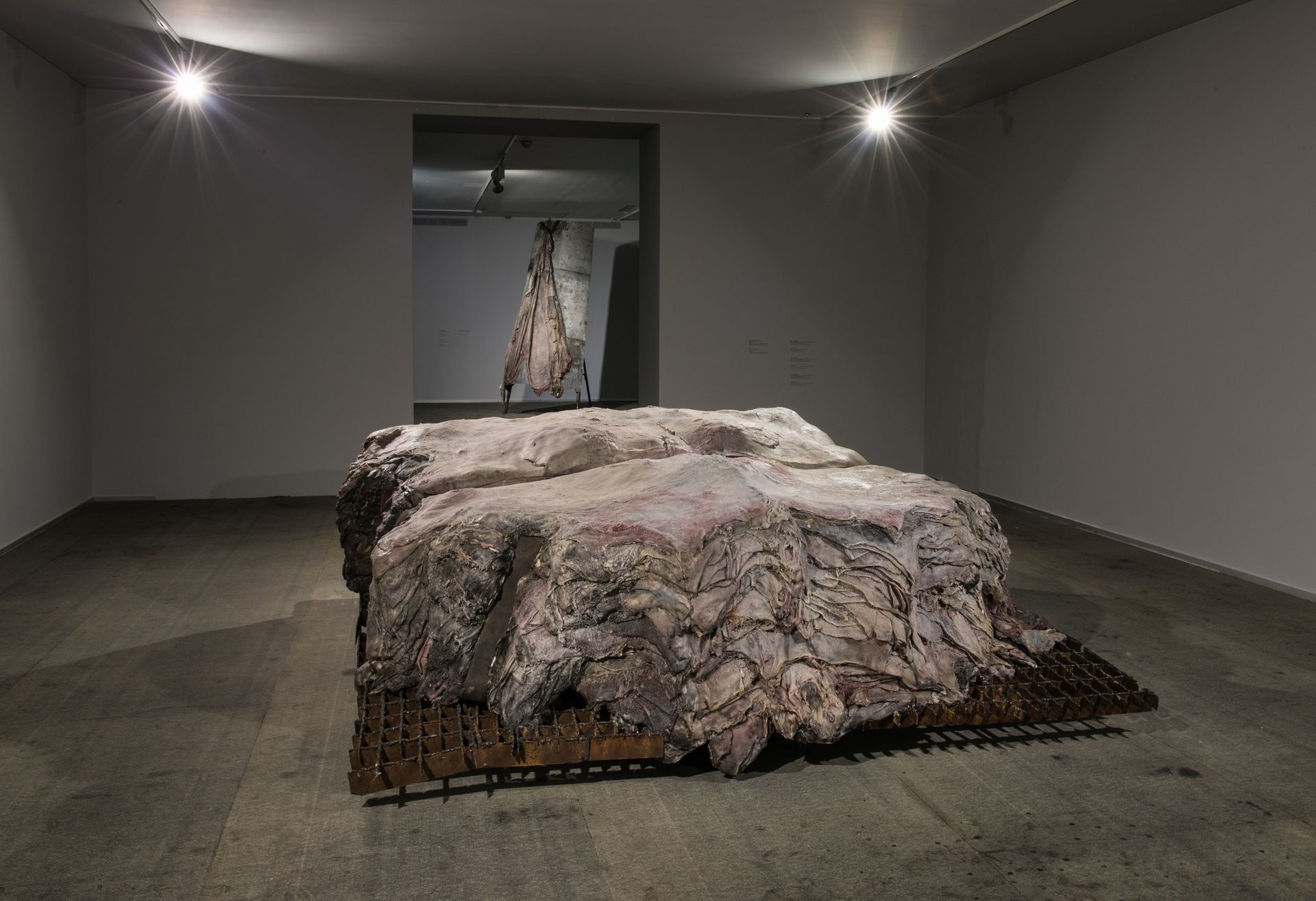 Penthisilea IV, (2016)by Berlinde De Bruyckereshows a fragile skin of flesh-like wax hanging through a rusty hook on a shield-formed steel surface. The confrontation between materials is sexual, harsh and fragile. A sense emphasized in a combination with a series of four drawings calledMet Tere Huid I-IV, (2016). Penthisilea IV proposes a singularity opposed toVanwege een Tere Huid IIIand IV (2016)two monumental sculptures of metal pallets with stacked animal hides (made from wax, polyester, and iron). The initial sculptural form of these works is inspired by observations of the processing of animal hides in a slaughterhouse. De Bruyckere used however a colour palette that replaced sense of the animal hides by that of human skin. And through the sculptural process the layers of skins start suggesting a presence of bodily forms. It brings to mind a landscape of people piled up and molten into each other. Although the image is dark and apocalyptic De Bruyckere speaks of a dying together opposed to a lonely death. It suggests through all the violence, the loss and pain a spark of hope.