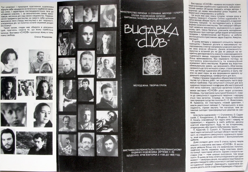 Брошура з Виставки «СНОВ», що відбулася у 1992 році у Києві після мистецького пленеру у Сєдневі, Чернігівської області. Брошура зроблена у форматі книжечки, у середині книжечки лежать окремі аркуші. Інформація, що подається стосується художників та їхніх творів, що експонуються, а також на брошурі надруковано короткий текст до виставки. На звороті надруковано кольорові репродукції картин художників, однак без підпису.