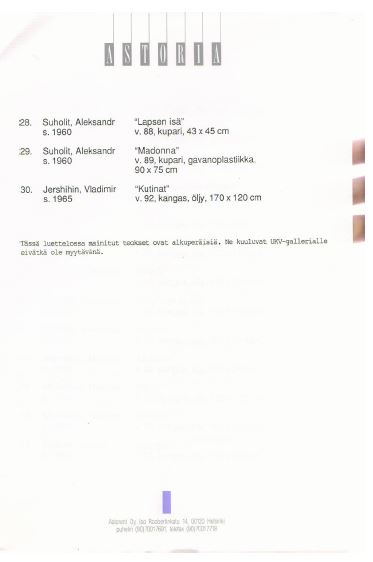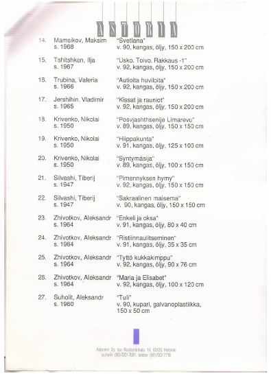 Перелік художників та творів, представлених на виставці «Нові художники з Києва», галерея Astoria, Гельсінки, Фінляндія, 1992, папір, друк, А4
