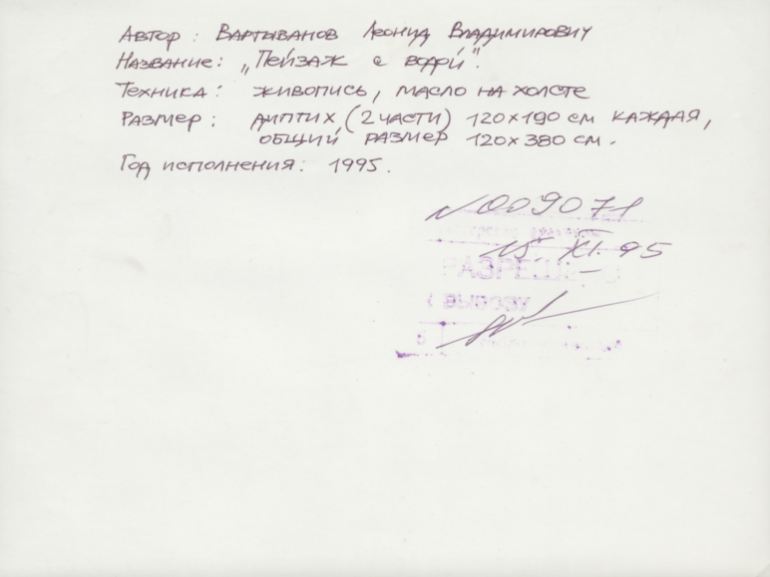 Посилання на об’ект документа: Леонід Вартиванов, 1995, Пейзаж з водою, диптих, полотно, олія, 120 х 190 см кожна частина