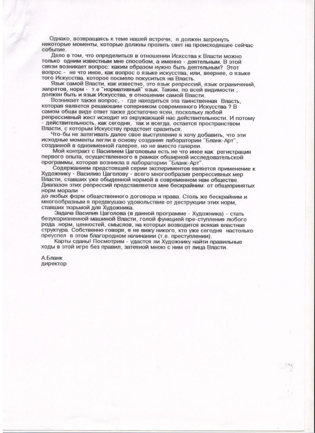 Посилання на об’ект документа: Василь Цаголов (за участі Олександра Бланка). За взаємною згодою (Трудова угода). 1995. Перформанс, текст