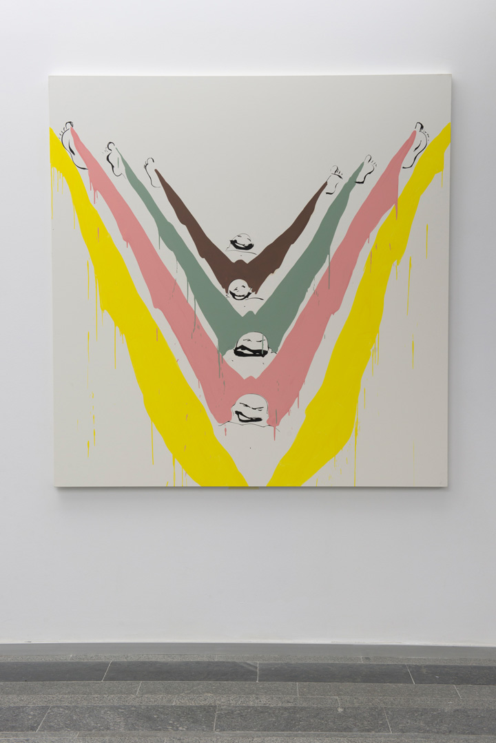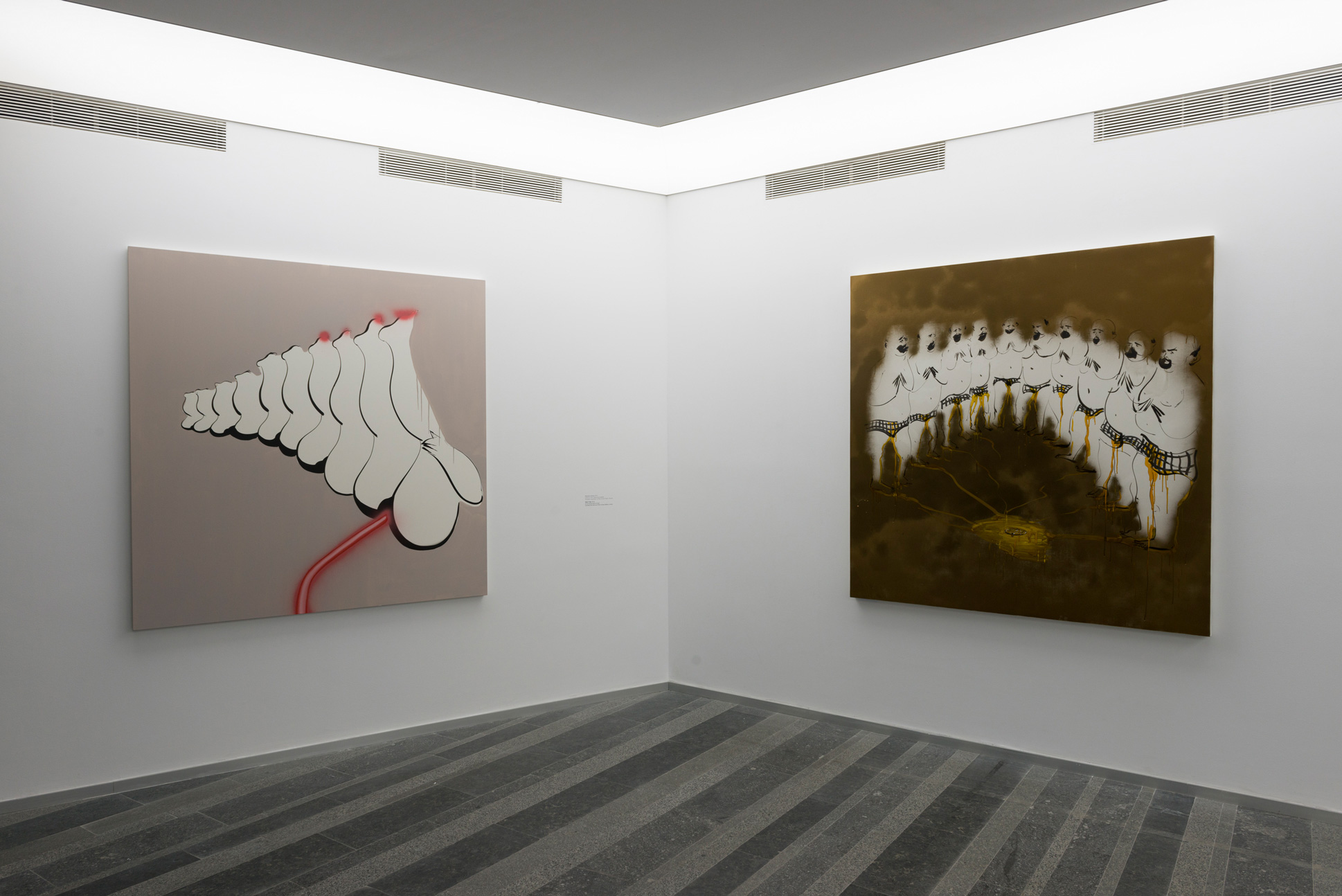 The subject matter of Tala Madani’s paintings mainly consists of men from the Middle East subjecting themselves and other men to fictional homoerotic sexual acts, torture or humiliation. Full of humour and irony, her paintings venture on a culturally confrontational discourse. Madani herself qualifies this as fascination for the male phenomenon. Her painting style is brutal, with intense colours and only the most necessary forms. Her large works create a sense of spatiality within abstraction and they reflect on “mass behaviour”. The smaller works focus on “private behaviour” and it is easier to read them as small narratives.