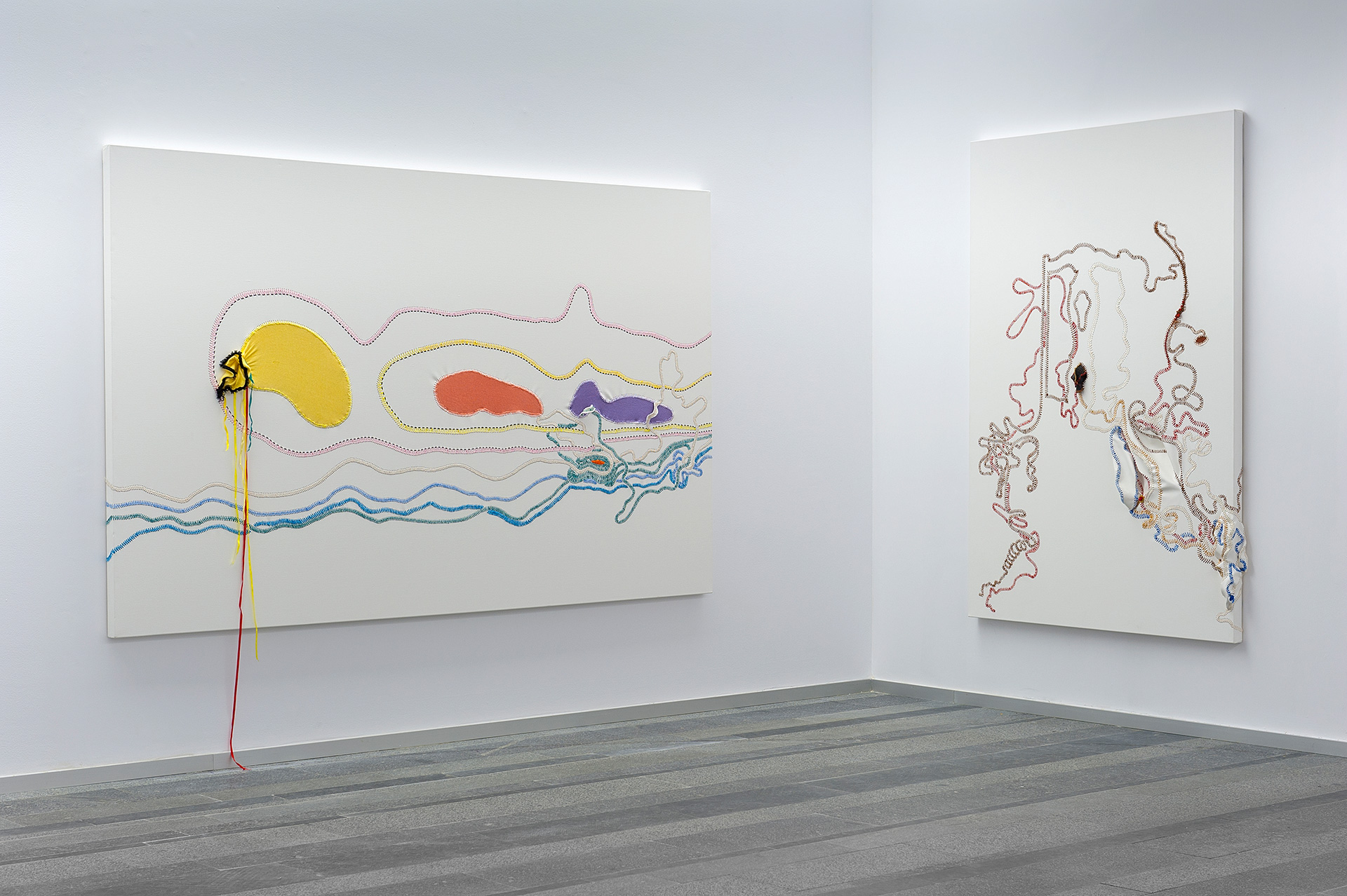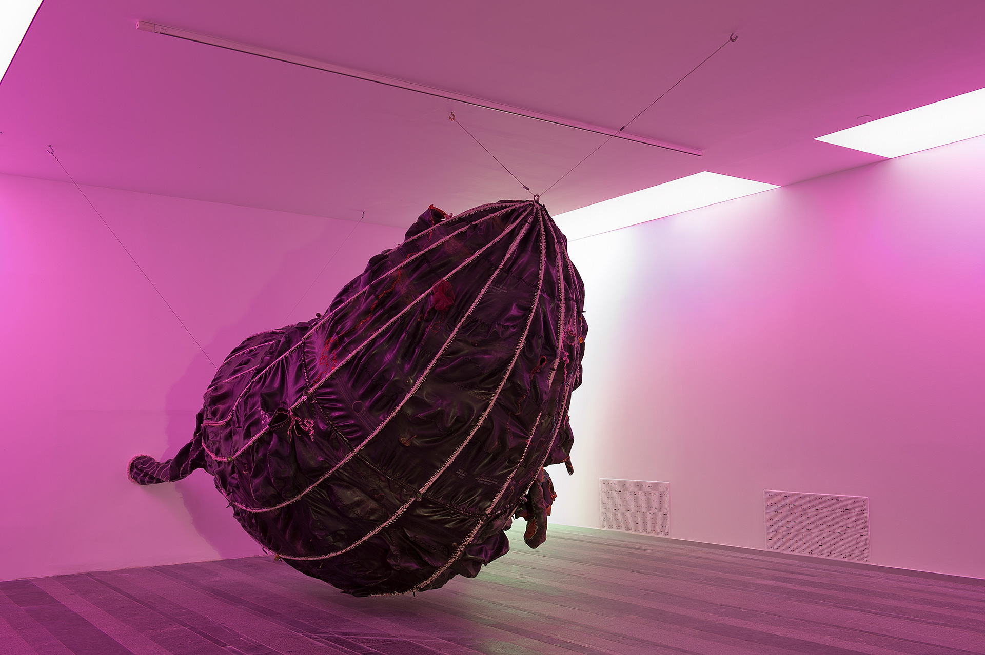 Hlobo creates large-scale sculptures using rubber as his main material, depicting phalli, internal organs or scenes deeply connected to a gay underground scene. His main themes include industrialization, gender and sexuality. Colourful ribbons, which are stitched and woven through the rubber, refer to the balance between male and female. By appropriating his native heritage, the Xhosa culture, and combining it with the journey of his own homosexuality, Hlobo finds his way through a rapidly changing society in which the traditional and the modern often are uncombinable. Hlobo’s work balances between the hidden and the public in his sculptural language and through the titles, which remain a secret to us as they are in Xhosa.