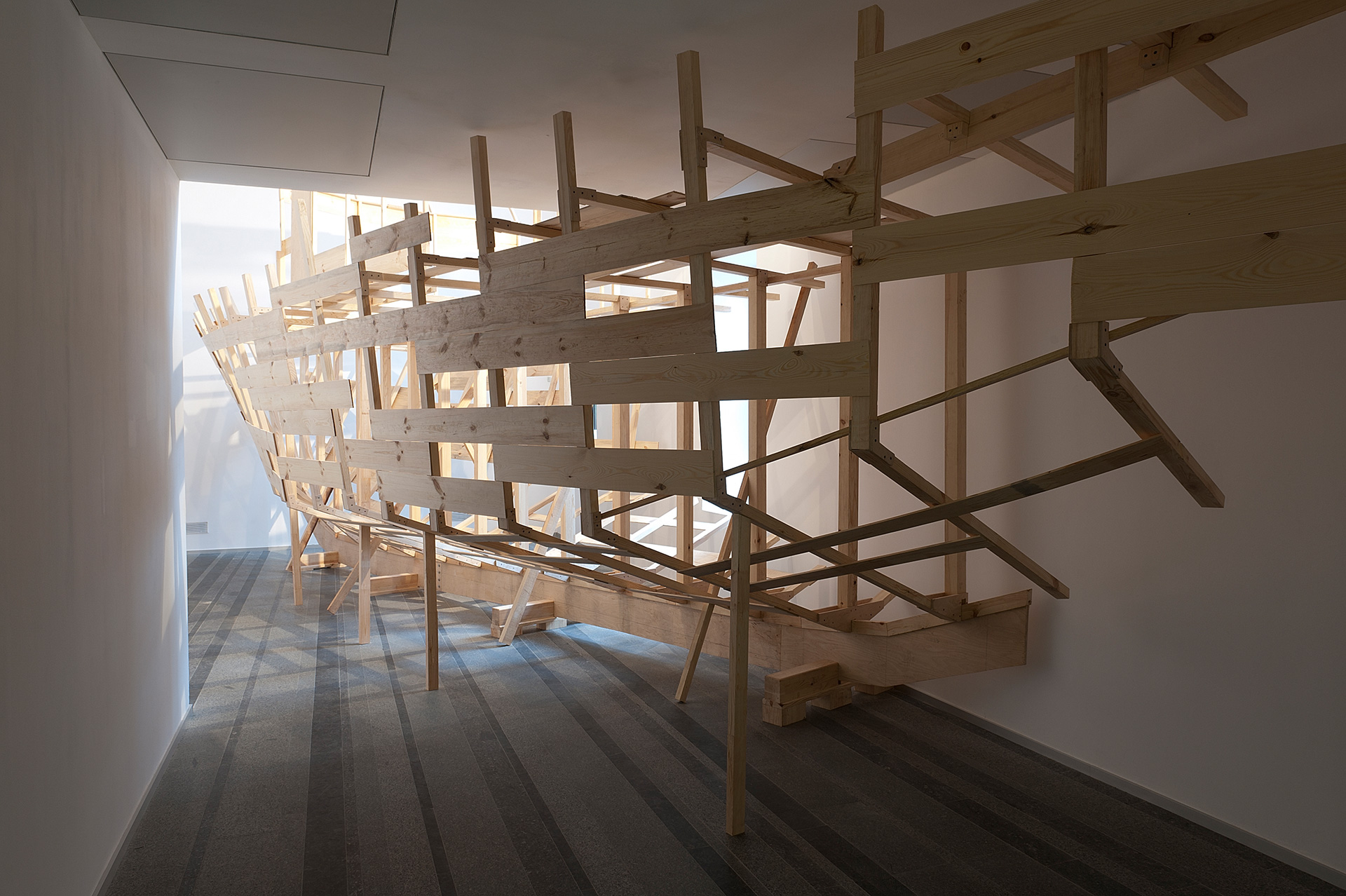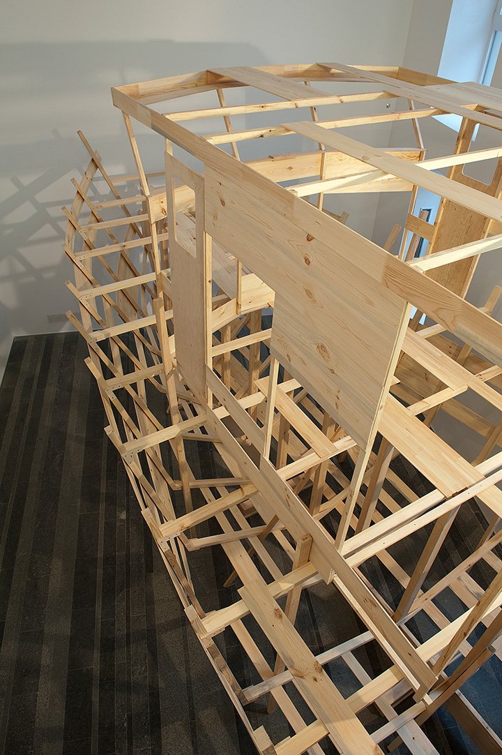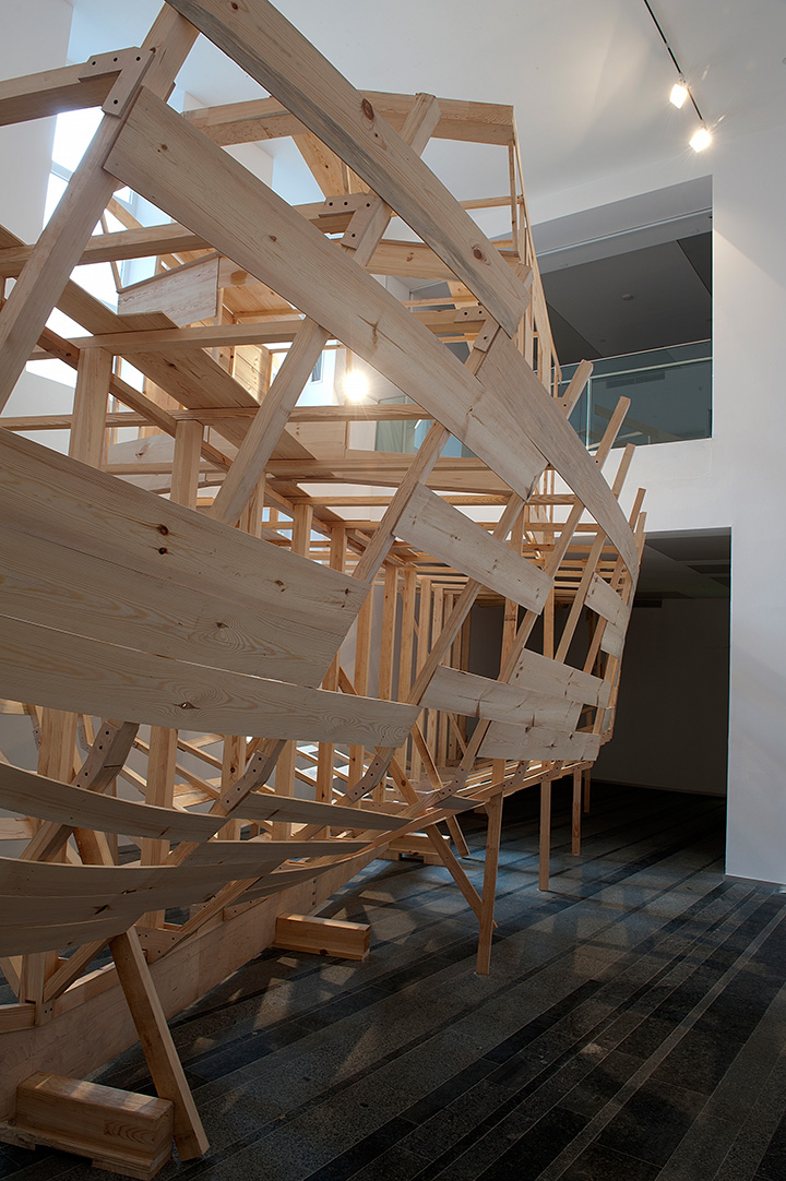 To bring an ideological system to its absolutely emancipated form is rarely a successful experiment, as the system itself adapts to the reality of its surroundings, loses its purity or stops its growth. The reflection on these ideological structures, which have a historical, social, political or cultural origin, is the central theme of Hector Zamora’s sculptural installations. In PAC, Zamora introduces a boat that could not be finished since the physical space where the construction started proved too small. He reflects on the former political model of socialism and the marks it left on society. But the work reaches beyond that, as the boat itself has a complex symbolical and iconographical tradition, which transcends different cultural identities.