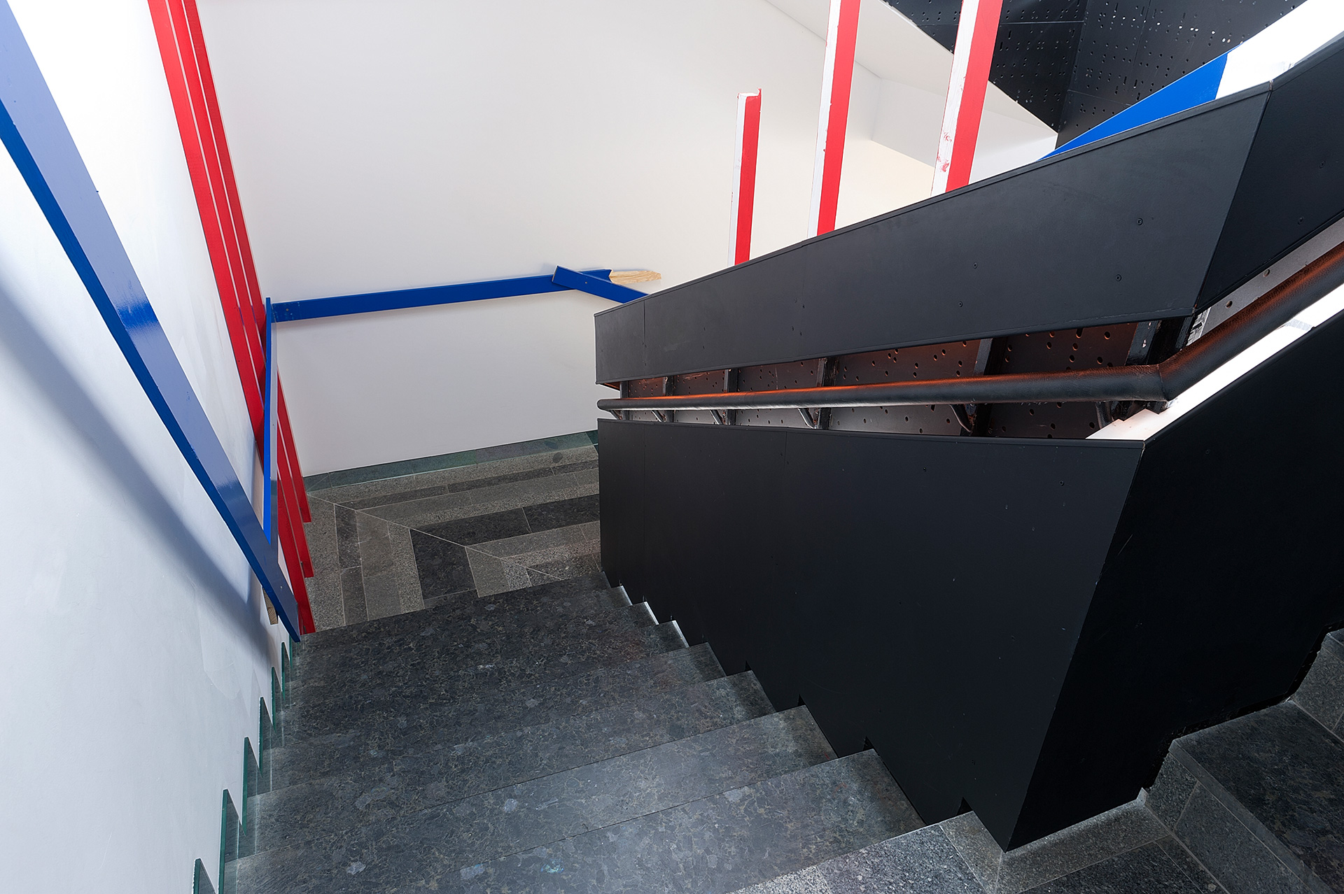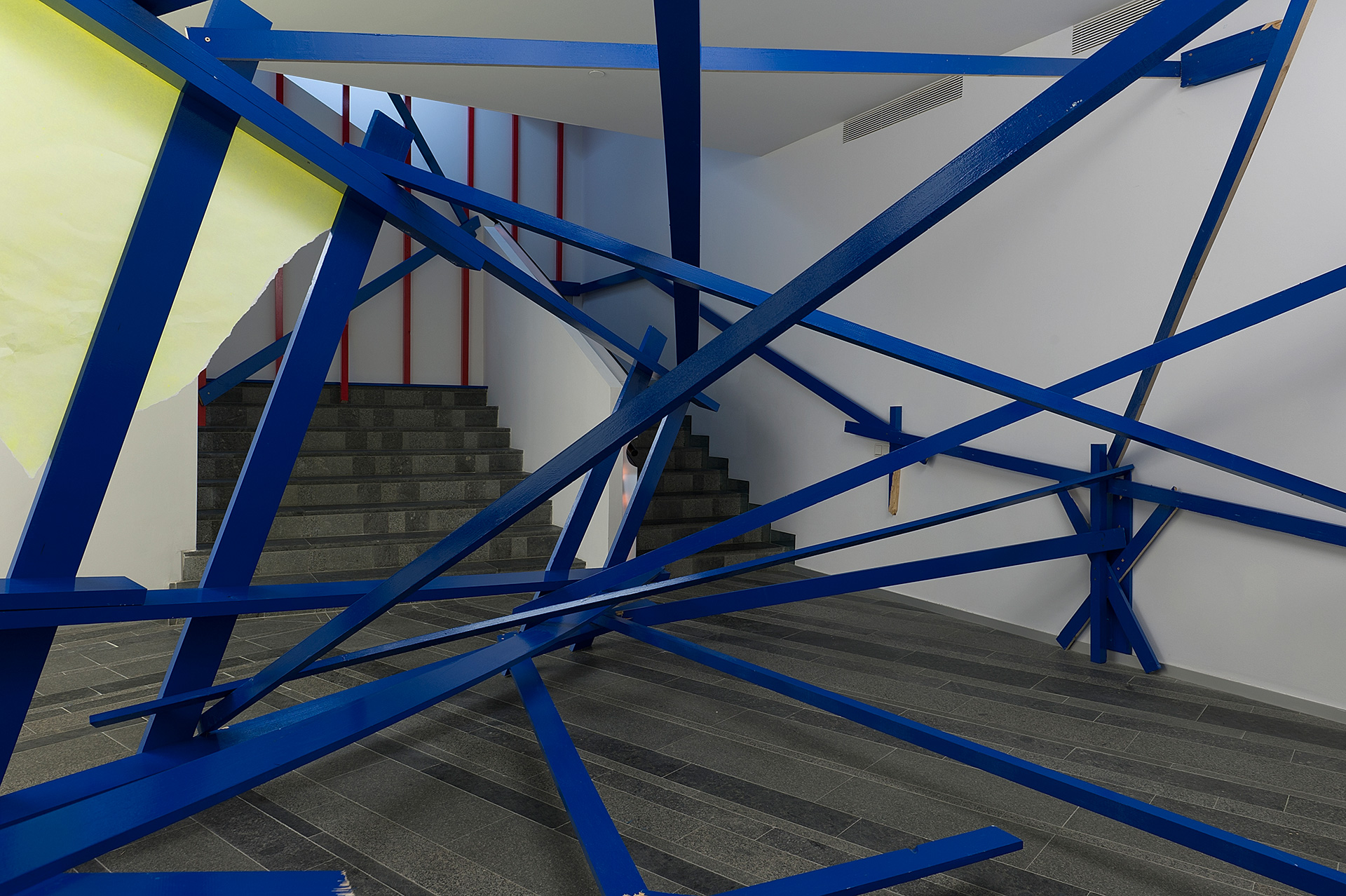 The installations of Clemens Hollerer are based on “found situations” that have become dysfunctional, elements that are disturbing the functional urban space and form the basis for Hollerer’s strategy of site-specific reflection on the found situation in the gallery. He deconstructs the outside to bring it inside, disrupting the gallery space, making the space itself part of his quasi-architectural installation. By always reacting on the exhibition space and using a clear colour scheme, Hollerer maps the spaces, constructing them through de-construction.