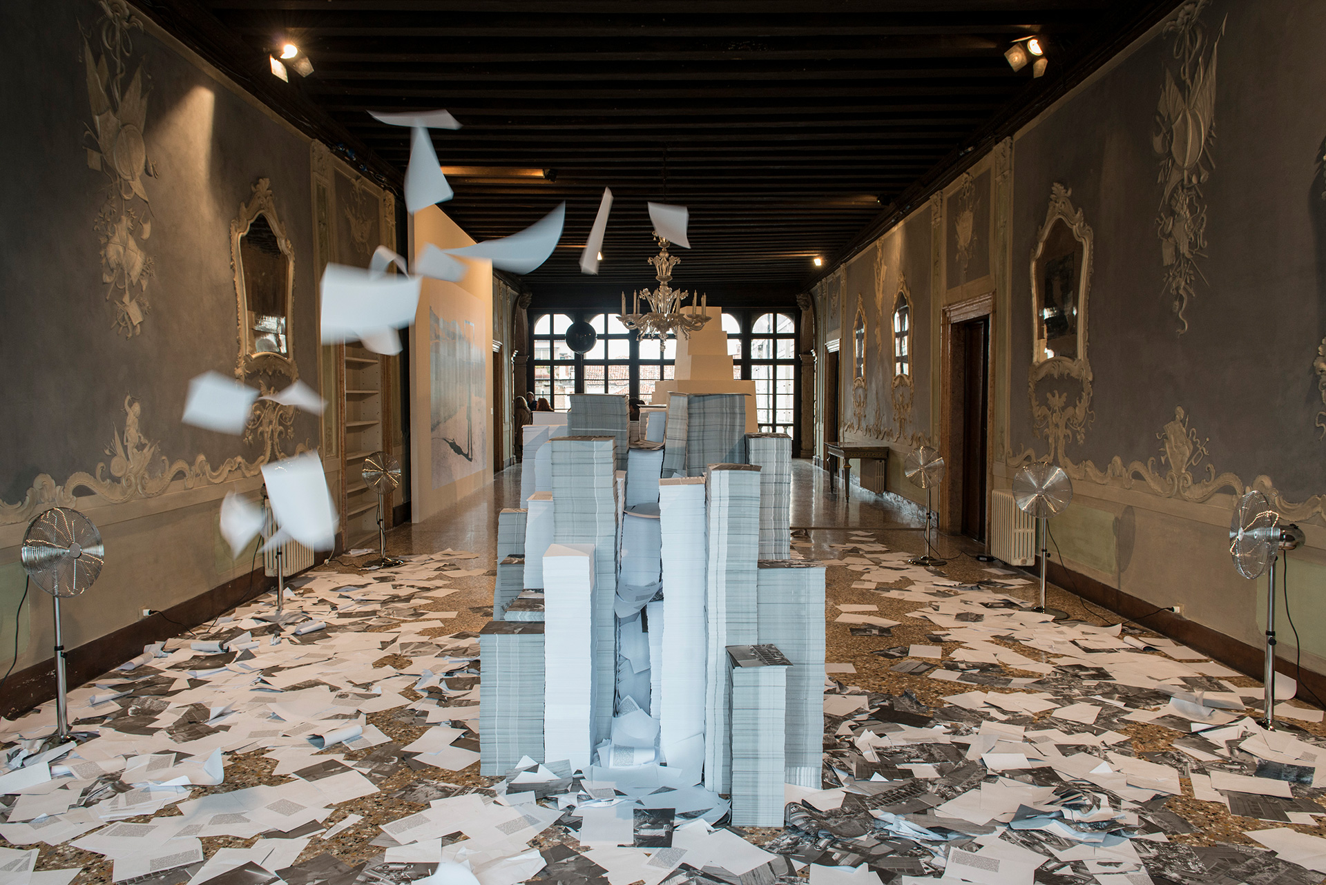 André Komatsu, Construção de Valores, 2012. Iindustrial fans, photocopies on paper