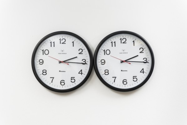Felix Gonzalez-Torres “Untitled” (Perfect Lovers), 1987-1990 Wall clocks 13 1/2 x 27 x 1 1/4 in. overall Two parts: 13 1/2 in. diameter each Edition of 3, 1 AP