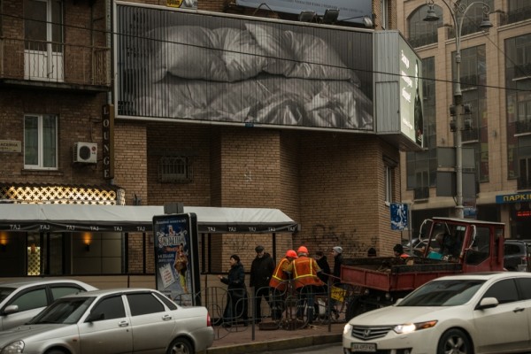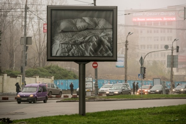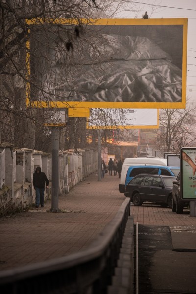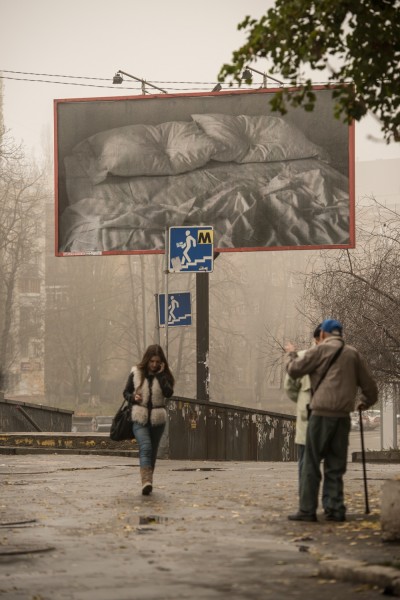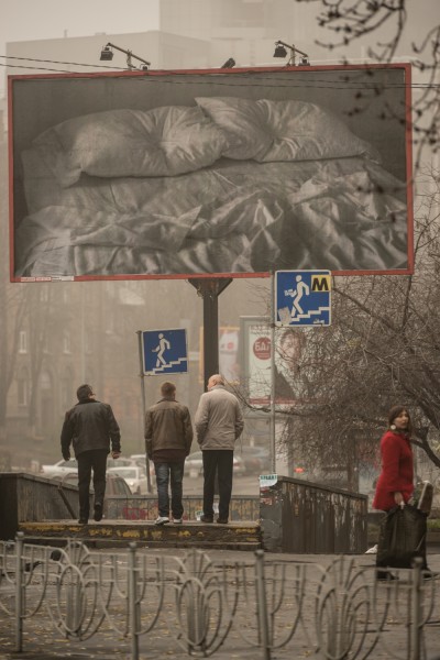 An image by Félix González-Torres, that was previously translated onto large-scale billboards and spread around New York City without any caption or explaination, now infiltrates the city of Kyiv. The photograph shows the artist’s bed with rumpled sheets and the impression of two heads on the pillows. Here González-Torres juxtaposes private and public spaces, referring to AIDS as an illness that affects both private and public life. The bed also represents a site of conflict, suggesting it ss a place of both love and lurid death.