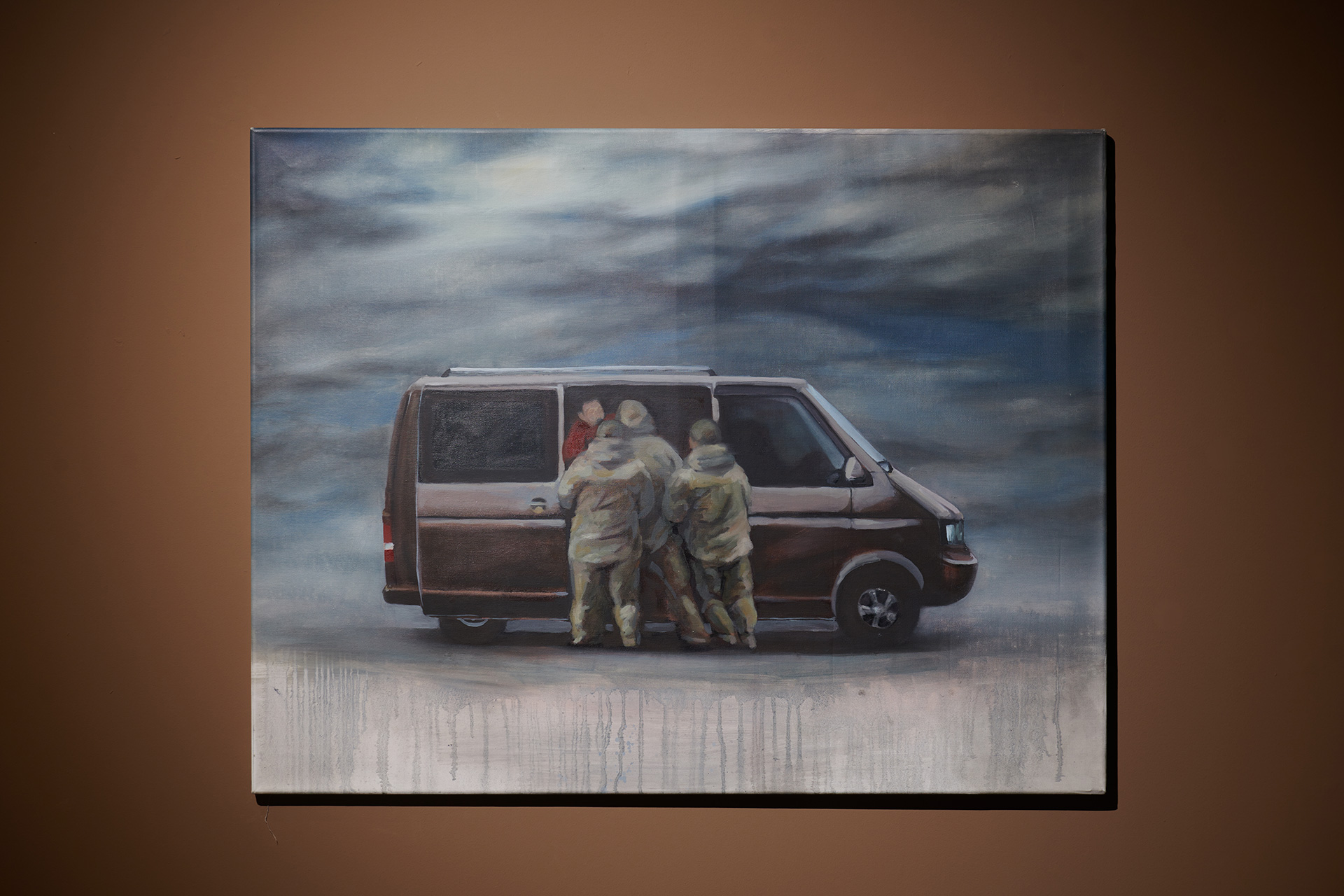 In contrast, Anna Nykytiuk’s work, displayed alongside Olga Stein’s installation, is strikingly direct — one might even call it a window to reality. Nykytiuk’s painting raises the question of forced mobilization, colloquially known as ‘busification’. There have been numerous cases of conscription squads abusing their power and resorting to force against those eligible for military service. The title of the artwork hints that such cases should not have occurred, hence Nowhere and with No One. The primary cause of this is obviously the war against Russia, a war conducted with a drastic lack of human resources. The Russian war of aggression has turned human lives into means and targets that need to be protected. Therefore, contemplating the choice is almost inappropriate. Many people simply don’t have the luxury of choosing not to become heroes and give their lives for others. The lack of choice and the need to defend one’s country in the Armed Forces is a challenge that requires enormous effort from those who are drafted into the army. Having no choice and being required to defend the country in the Armed Forces is a challenge that demands immense strength from those who are drafted. That’s why respect — from both the state and society — is essential.