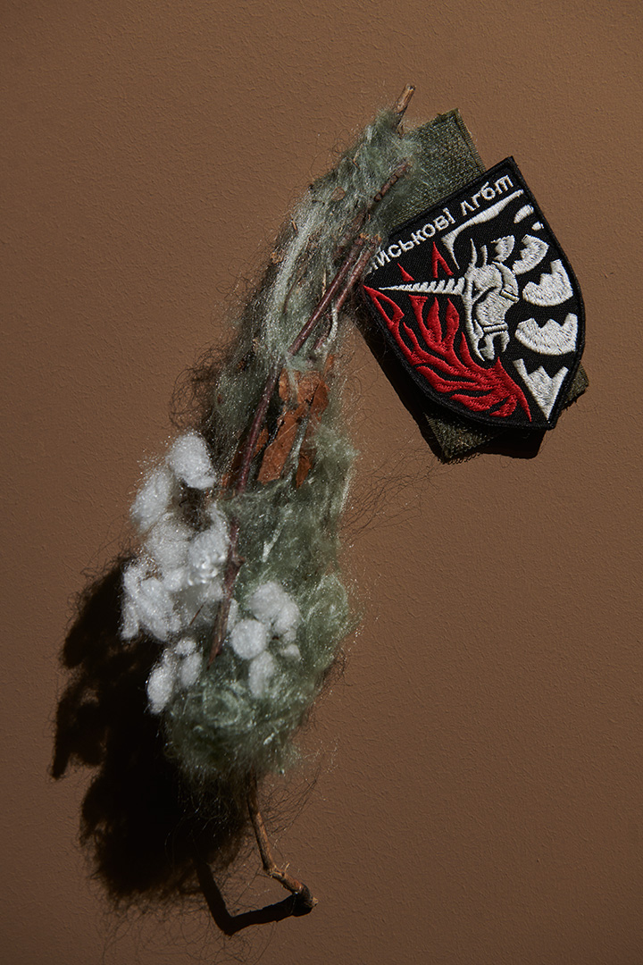A flower, made of branches, camouflage fabric threads, and synthetic insulation. Plisetskiy used to sew dresses and costumes for performances. While in the army, he created this plant from whatever he could find nearby. He adds that he is even more productive while serving than usual.
