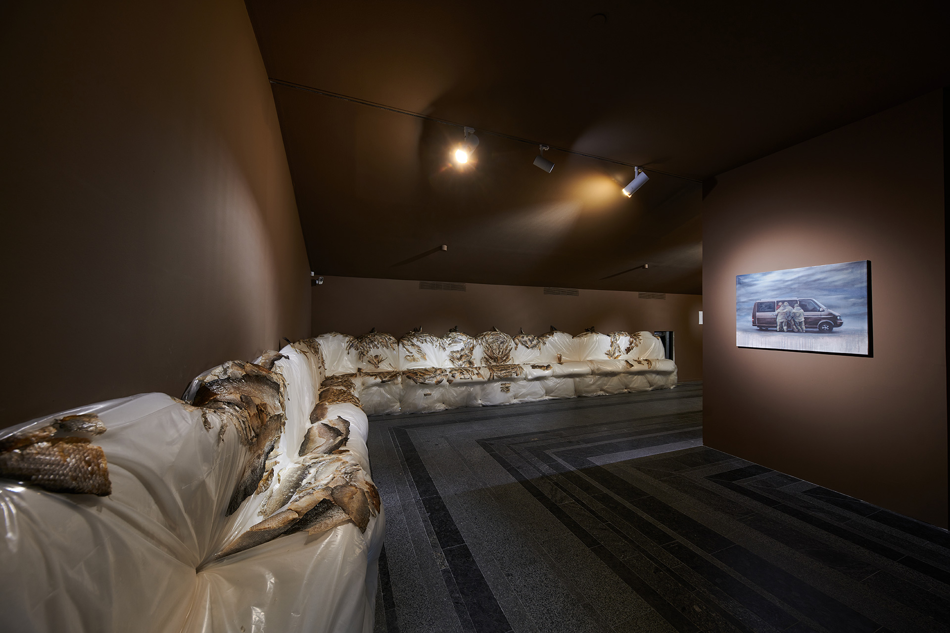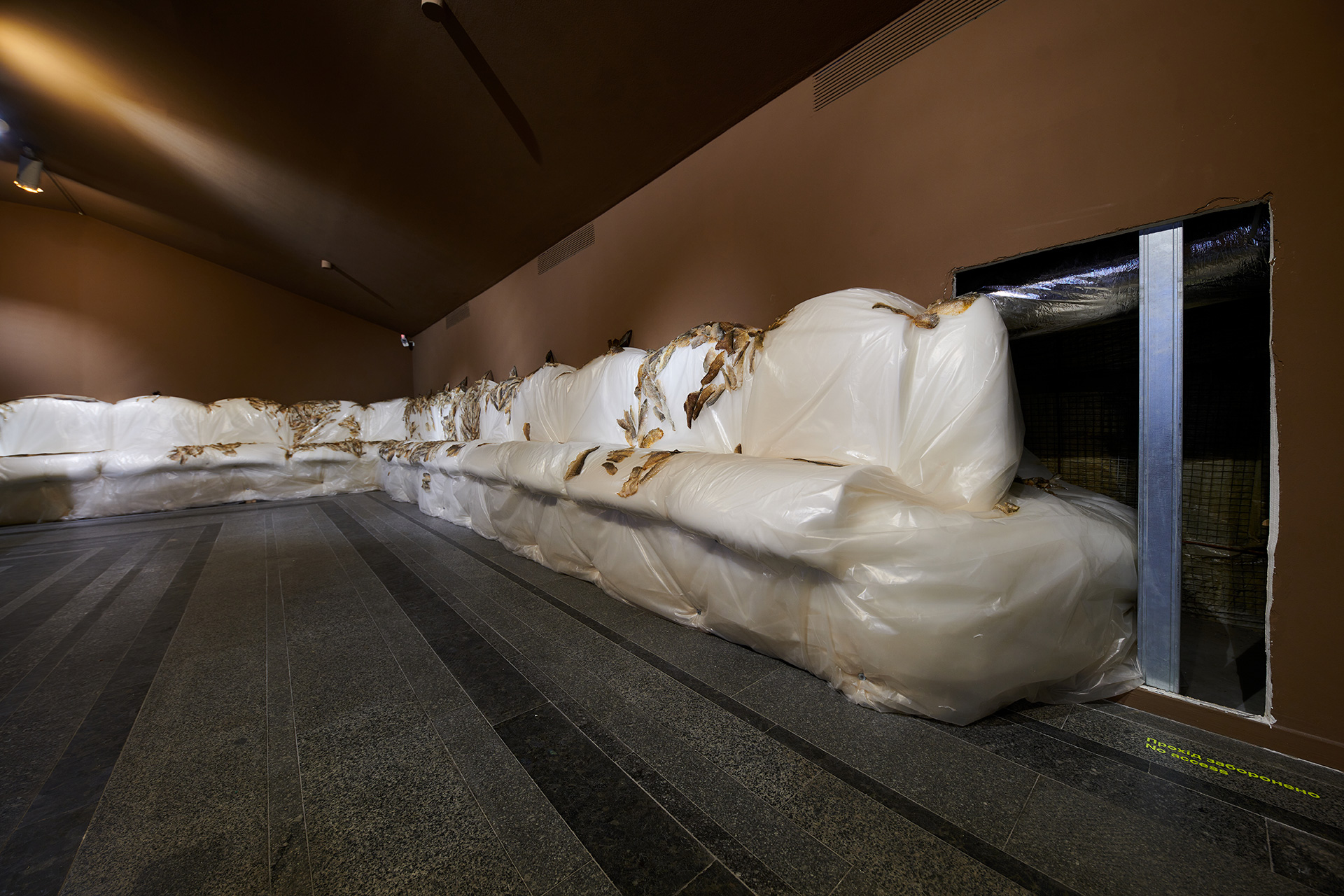 Some people say that it isn’t even a living organism, but simply part of the interior — some kind of sofa that can “accommodate your bum,” as the artist herself says. In this case, the object reflects certain societal relations in which there might not be enough space for everyone; consider, for example, a tram or an art center. Stein indicates that boundaries are continuously being mutually overstepped. This is precisely why she challenges the institution’s limits and disturbs its hidden corners. Mutations are never an individual process. Evolutionary changes that support life occur due to the coexistence of different species and the influence of the external environment. Can humanity evolve without destructive and parasitic relations, only with mutual cooperation?