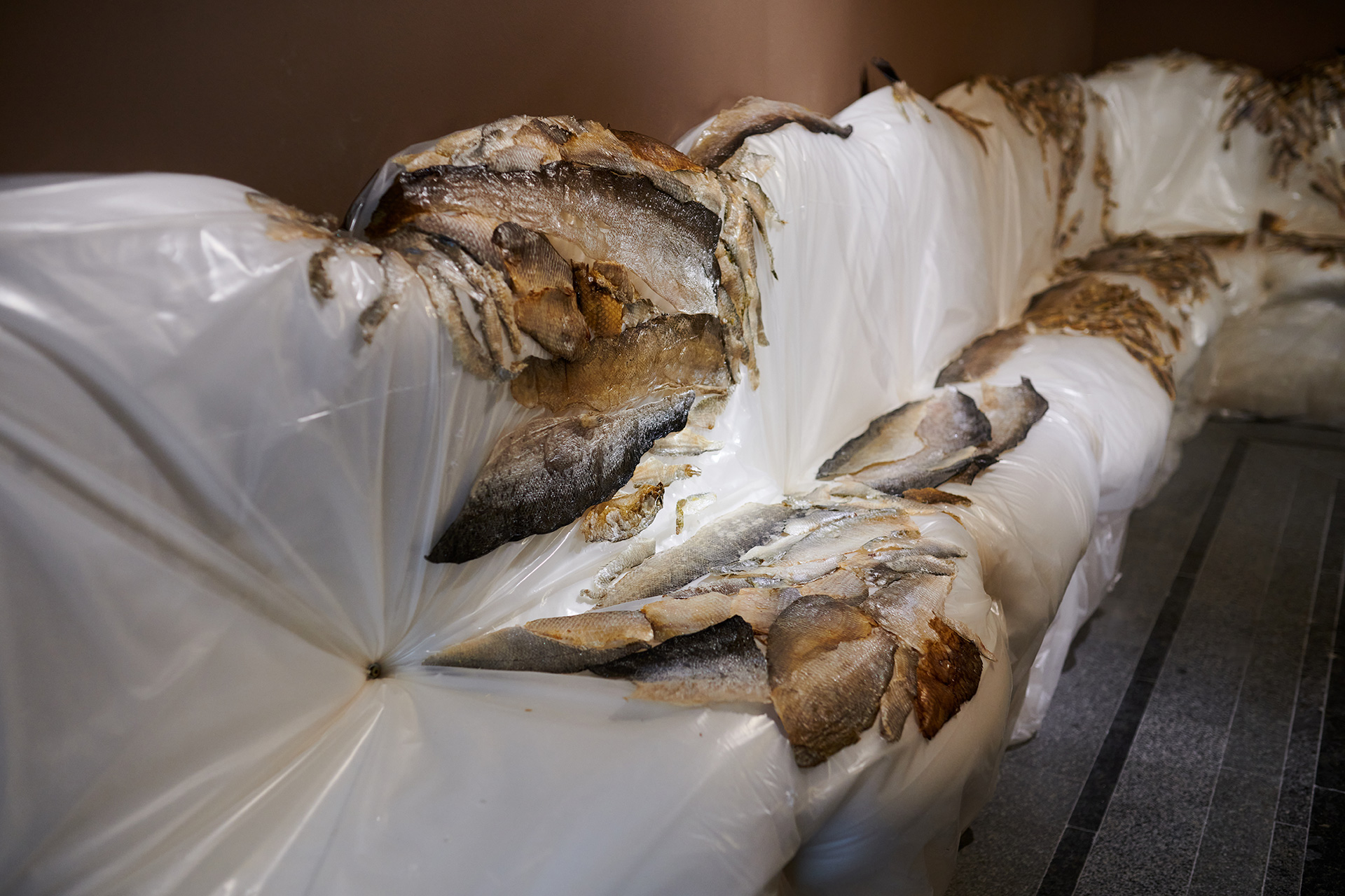 The metaphor created by Olga Stein in her work Sofa Form No. 3 can be interpreted in a variety of ways. The strange creature crawling out of the walls could be a worm or a snake. Alternatively, it could be some kind of mysterious interior object. It is also an ouroboros — “the one who devours his own tail.” It sheds its skin repeatedly to grow a new one, existing in a cycle of self-destruction and self-reproduction. This reminds of the way humanity reinvents itself after disasters. It is like a body whose cells constantly die and regenerate.