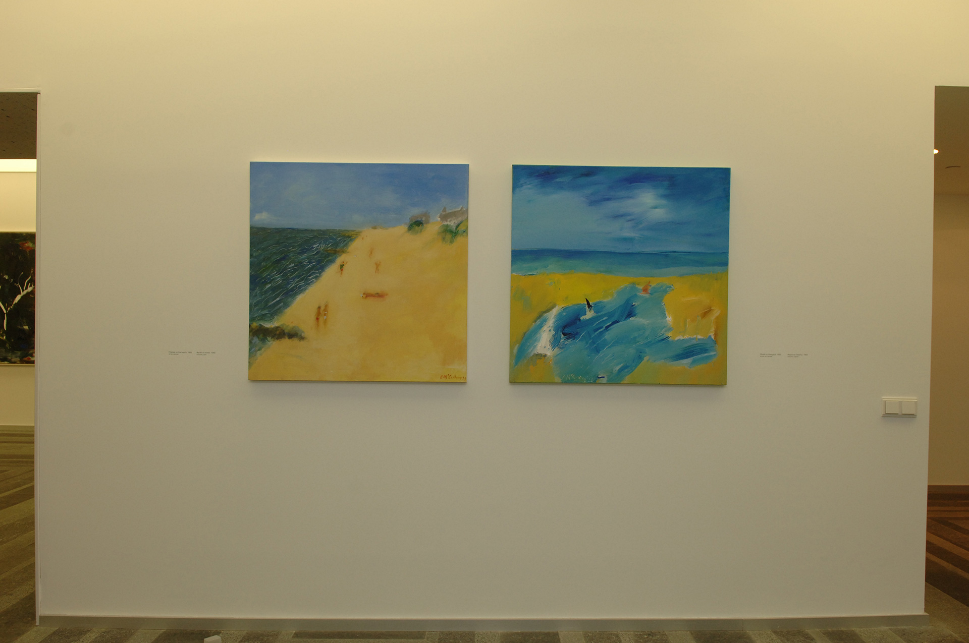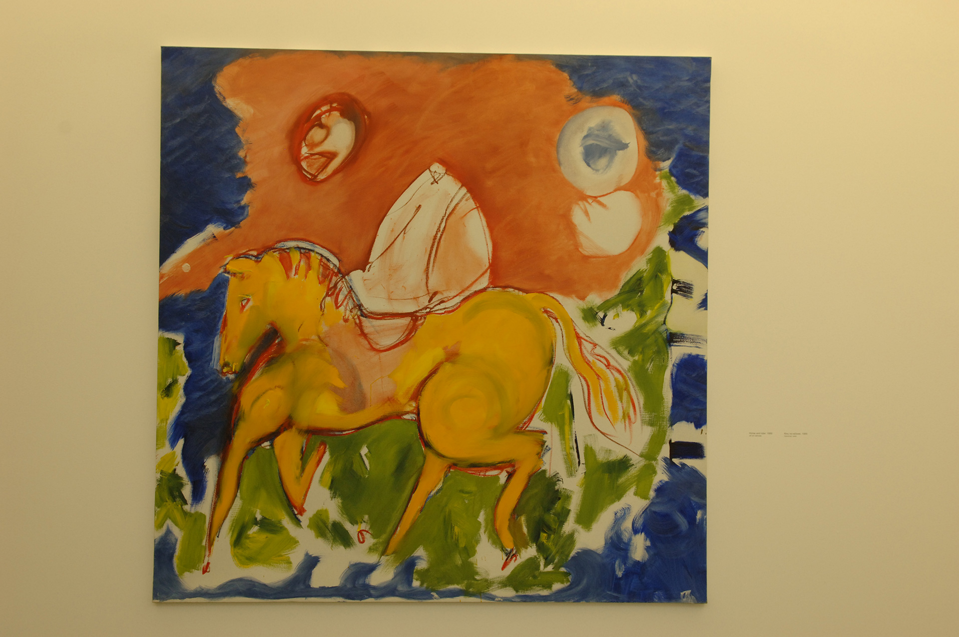 Big Mountain Face, 1991, and Pintos in the sky with desert poppy, 1991, on view