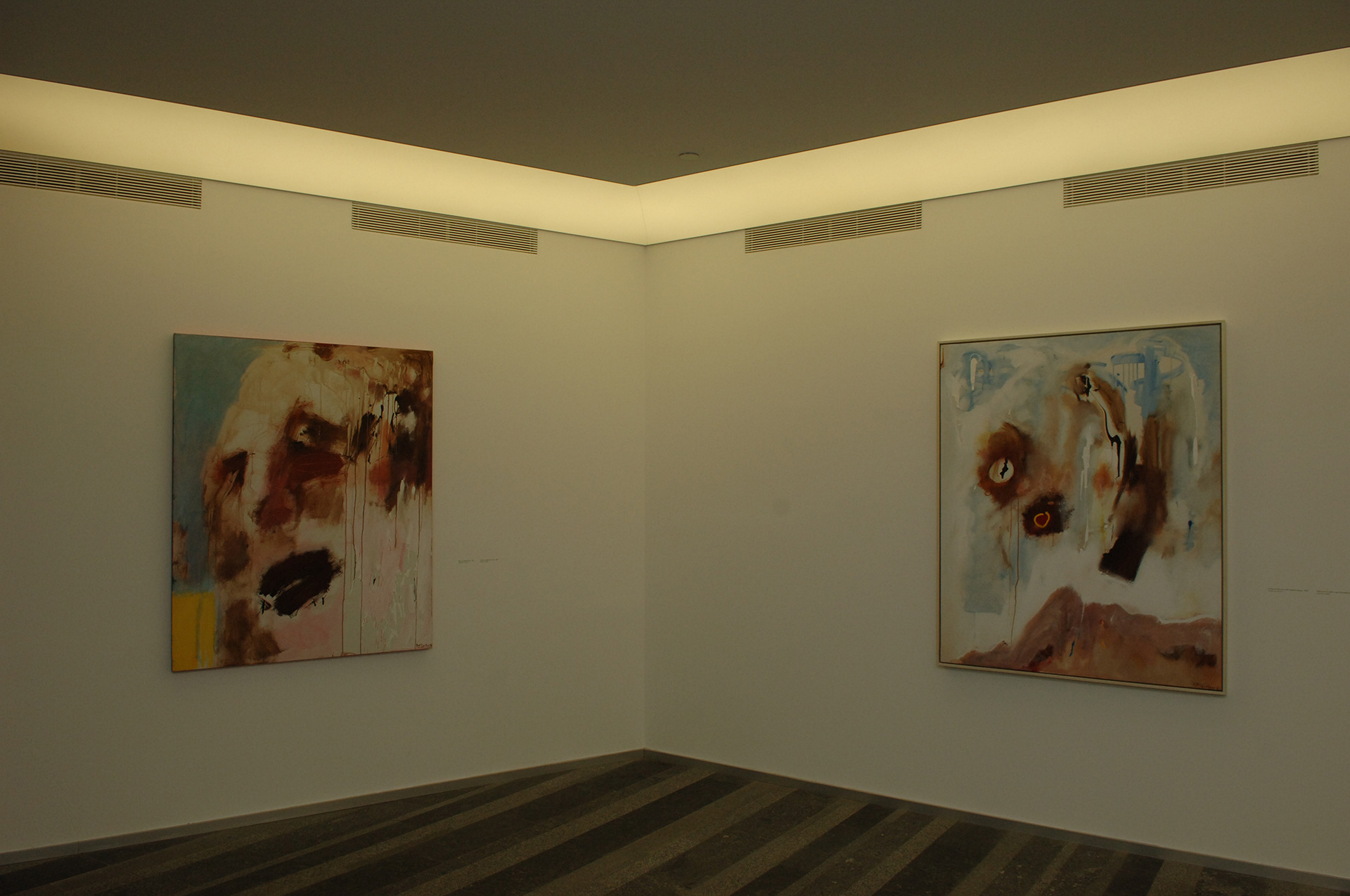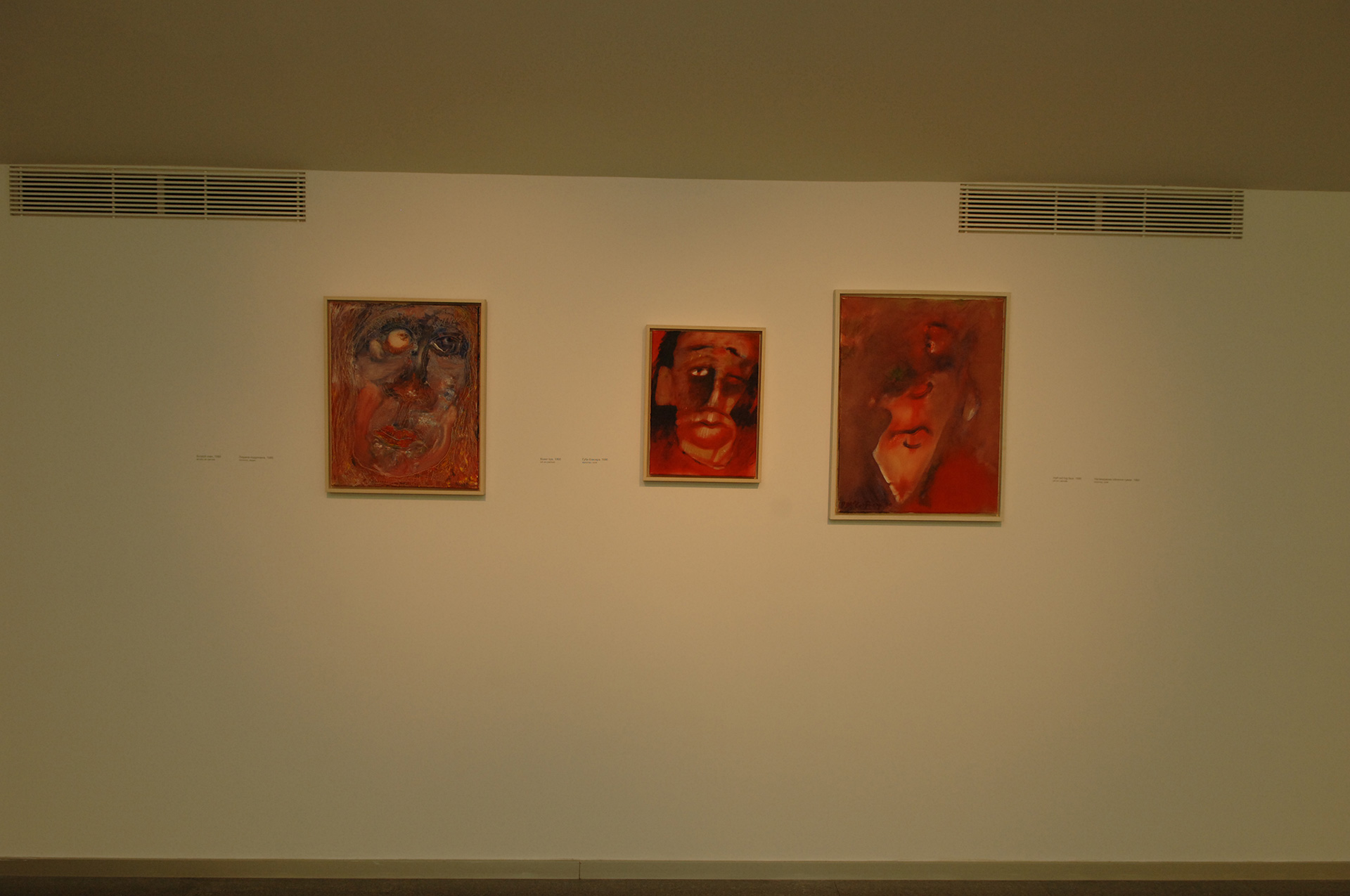 Scratch man, 1989, Boxer Lips, 1990, and Half Red Fog Face, 1990, on view