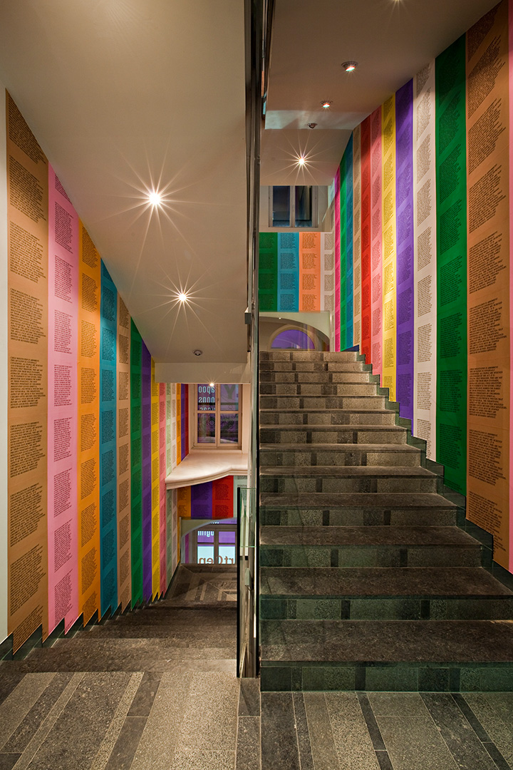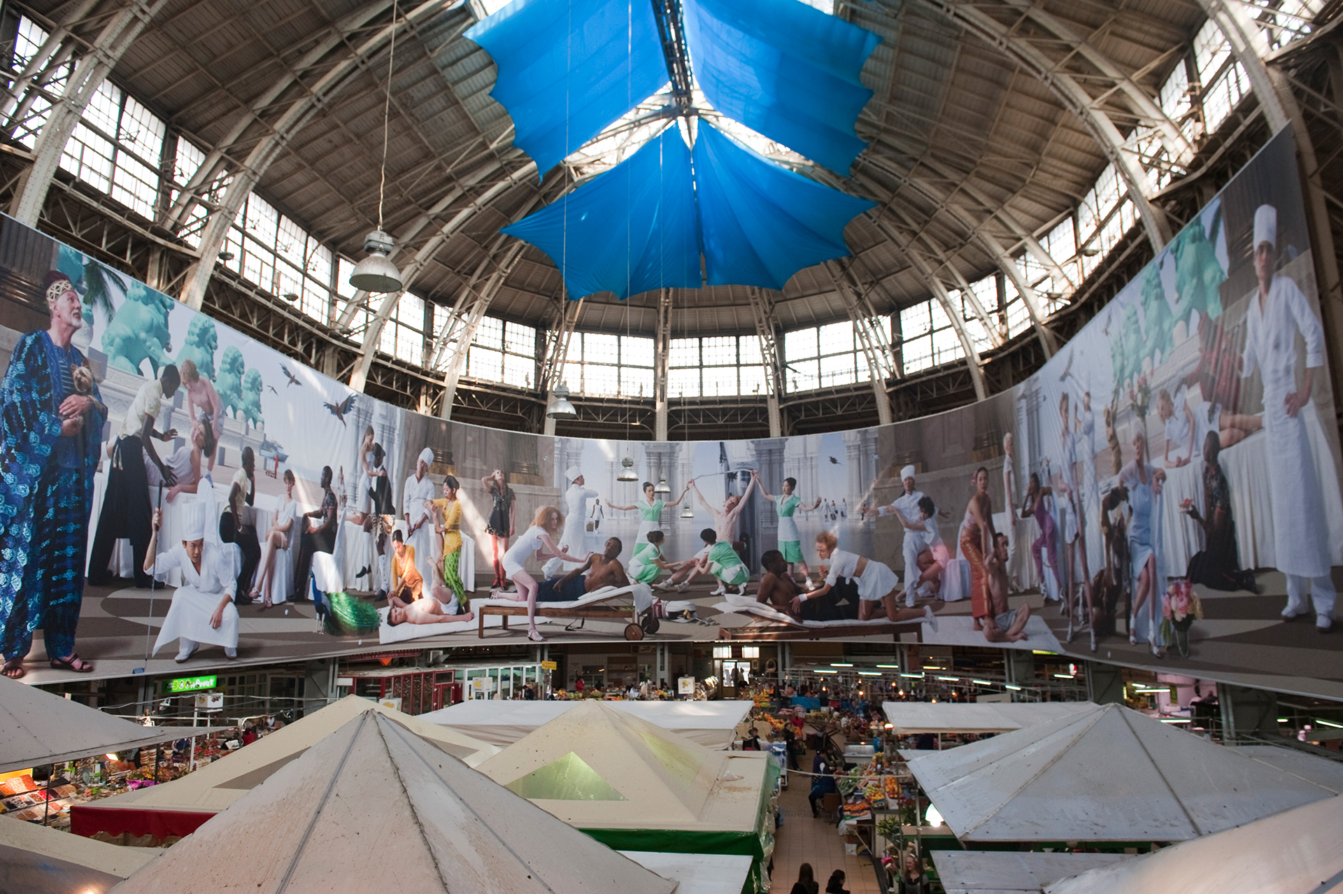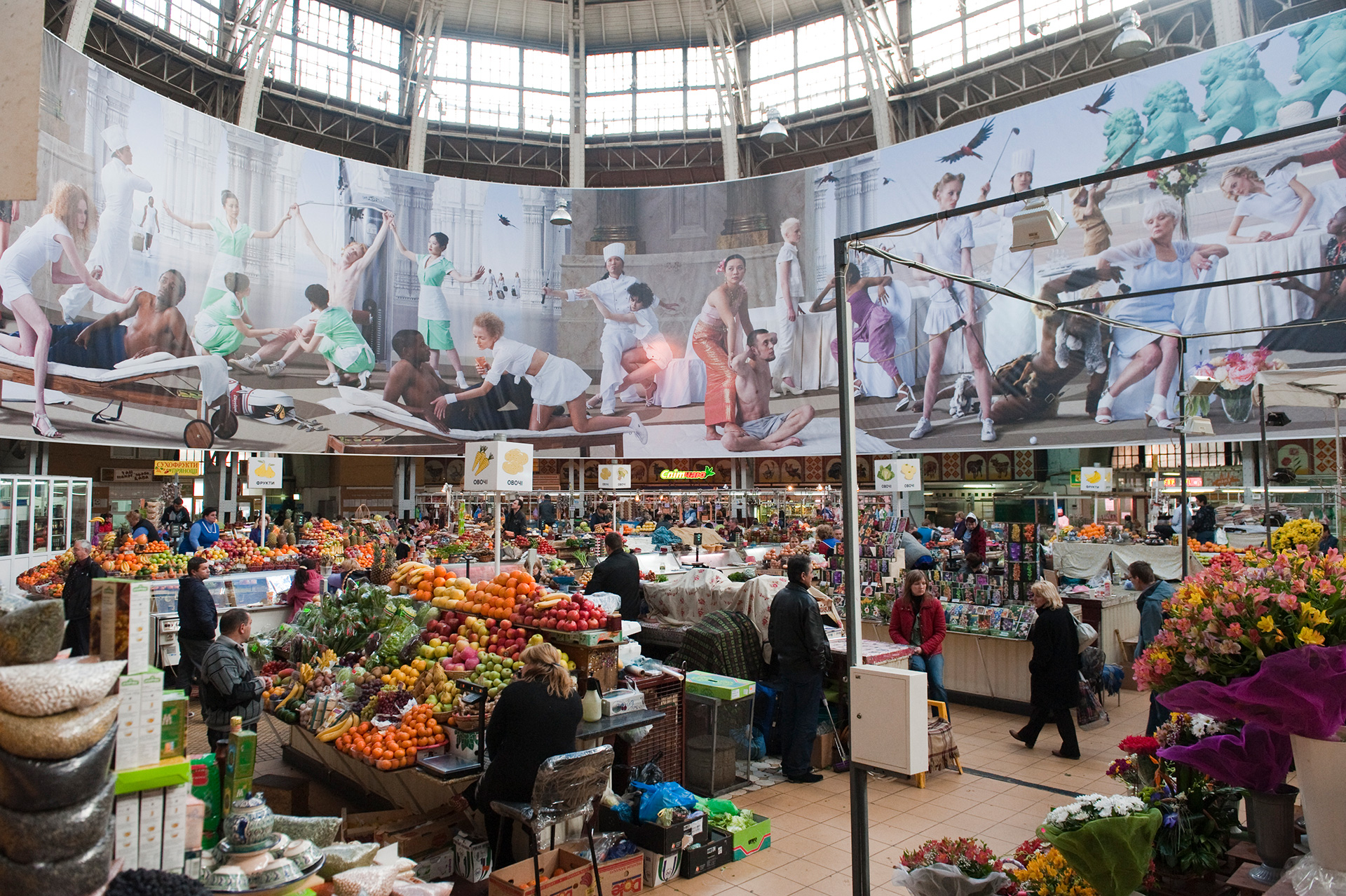 The exhibition presents nineteen work groups with a total of 150 individual works in twenty rooms on four floors of the PinchukArtCentre. The staircases of the building are used as art spaces for the first time with installations by Jenny Holzer; the central stairwell features an in-situ piece with her famous texts from the series Inflammatory Essays and a second staircase houses a work with LED. In addition, for the first time ever, the PinchukArtCentre utilised the historical Bessarabskiy market hall located opposite for an eighty-meter-long frieze by AES+F, a group of artists from Moscow. With its intense sociocultural flavour and distinctive architecture, this historical site, which is of great importancse for Kiev, provides an ideal public counterpoint to the artistic message propagating a new hybrid aesthetic of fusion.
