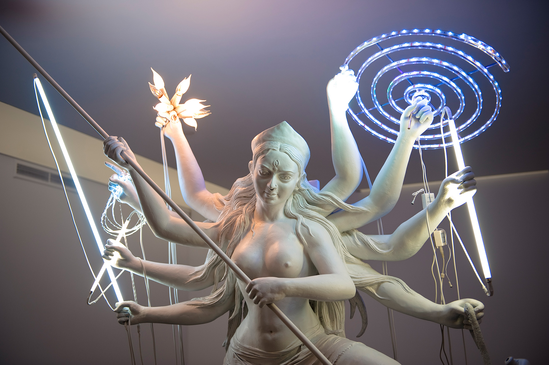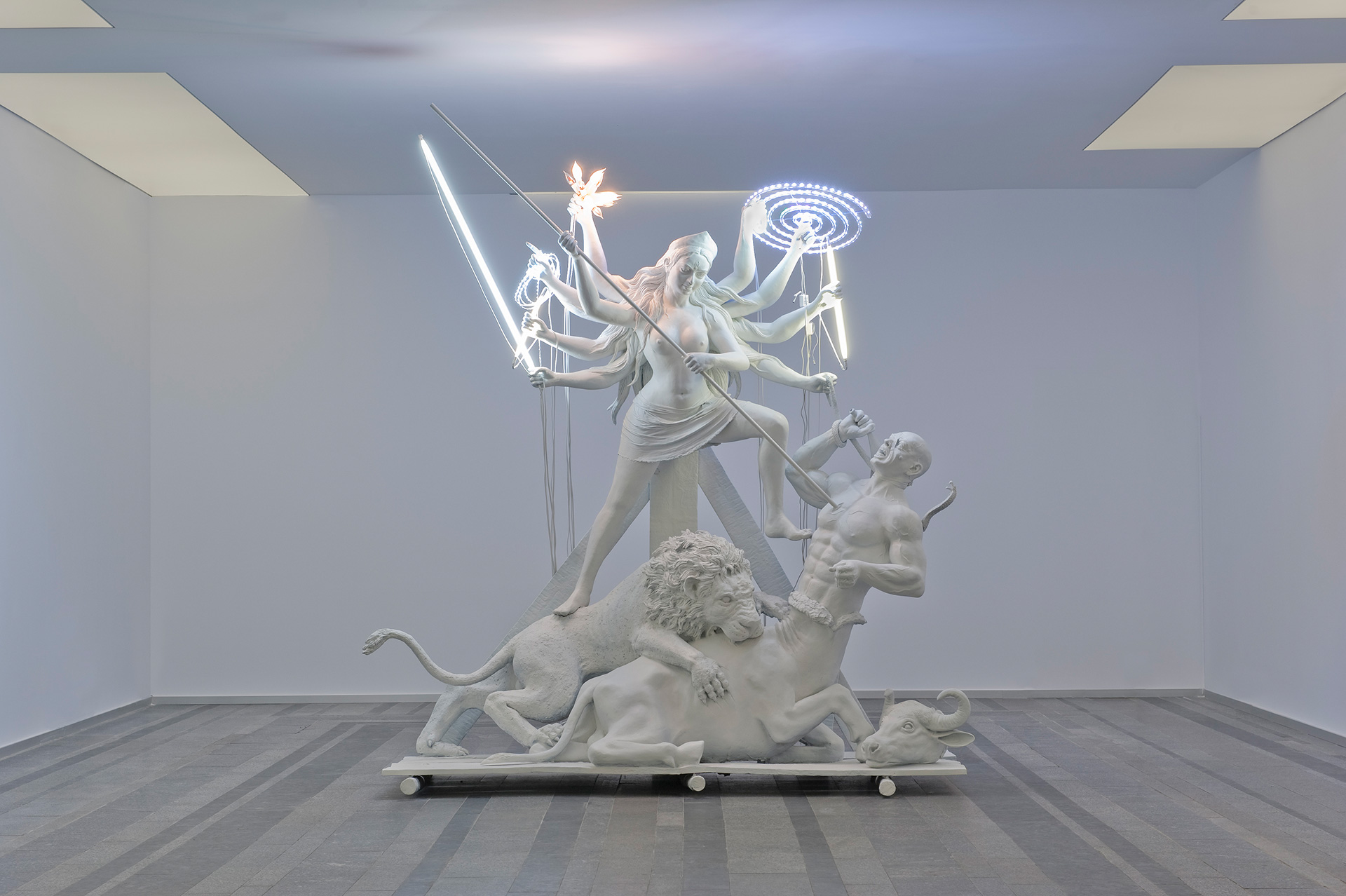Cosmic Battle introduces a new direction in Gupta’s work, transforming the ready-made idea by enriching it with narrative structure. With this sculpture, Gupta shows the collision of good and evil and at the same time creates a melting pot of two cultures, two beliefs and two iconographies. The sculpture depicts Durga, a Hindu female warrior goddess who was born out of the cosmic energy of the defeated male divinities. She is shown riding a lion and holding her weapons, including the snake. She fights the centaur, a figure from Greek mythology, described in Dante’s Divina Commedia as demons patrolling the banks of the river of blood, using their weapons to keep the souls at their assigned depth. Again Gupta twists the sculpture by painting it white, effectively cooling down its dramatic form. The transformation of the sculpture continues through the use of light elements which gives the work a divine aura and reinforces in a surprising way the dramatic aspect of this “Cosmic Battle”.