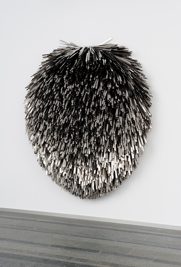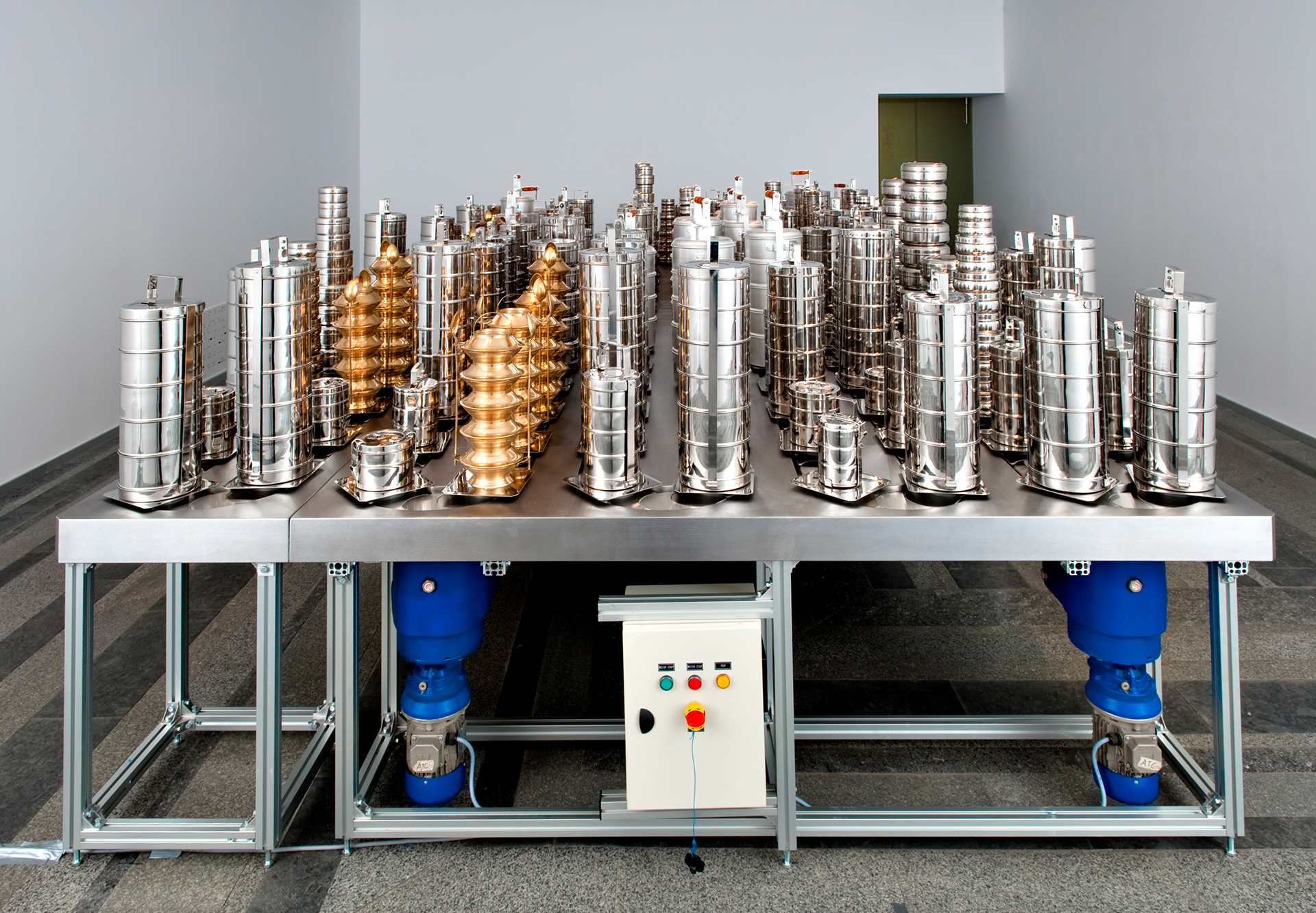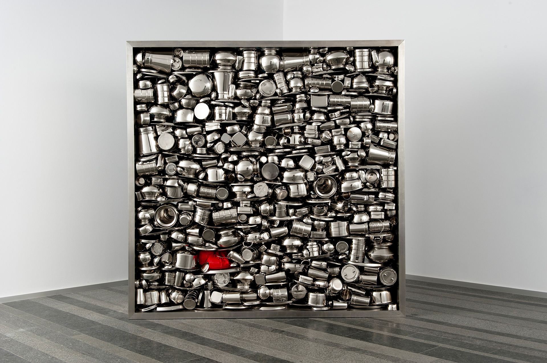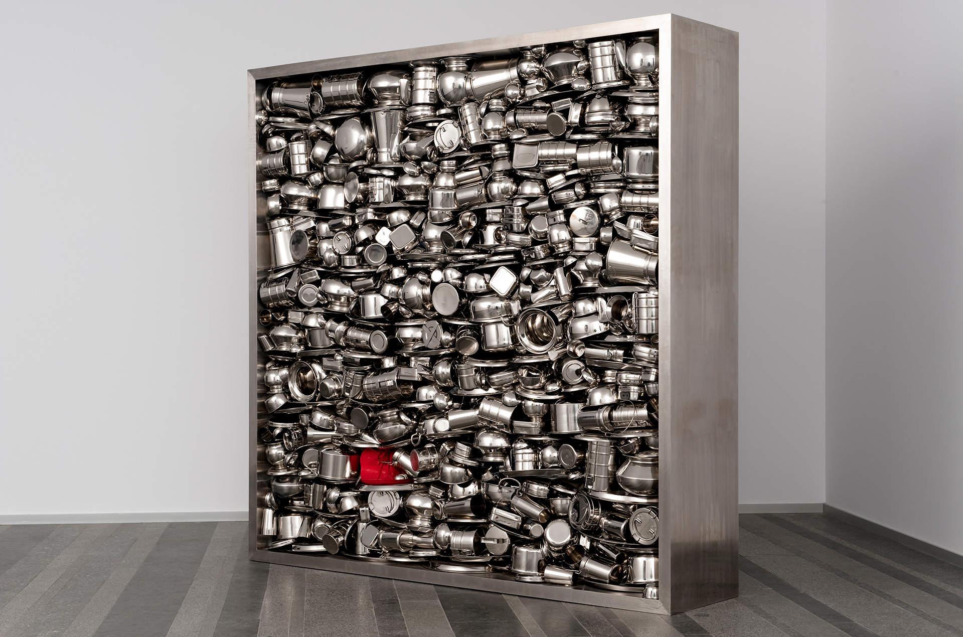 The ready-made object of the kitchen utensil often used by Gupta, contains both a strong historical significance and symbolic meaning, demonstrating the economical and cultural change in his country. In Faith Matters, this break is visible by combining the stainless steel objects with “skyscrapers” made from brass.