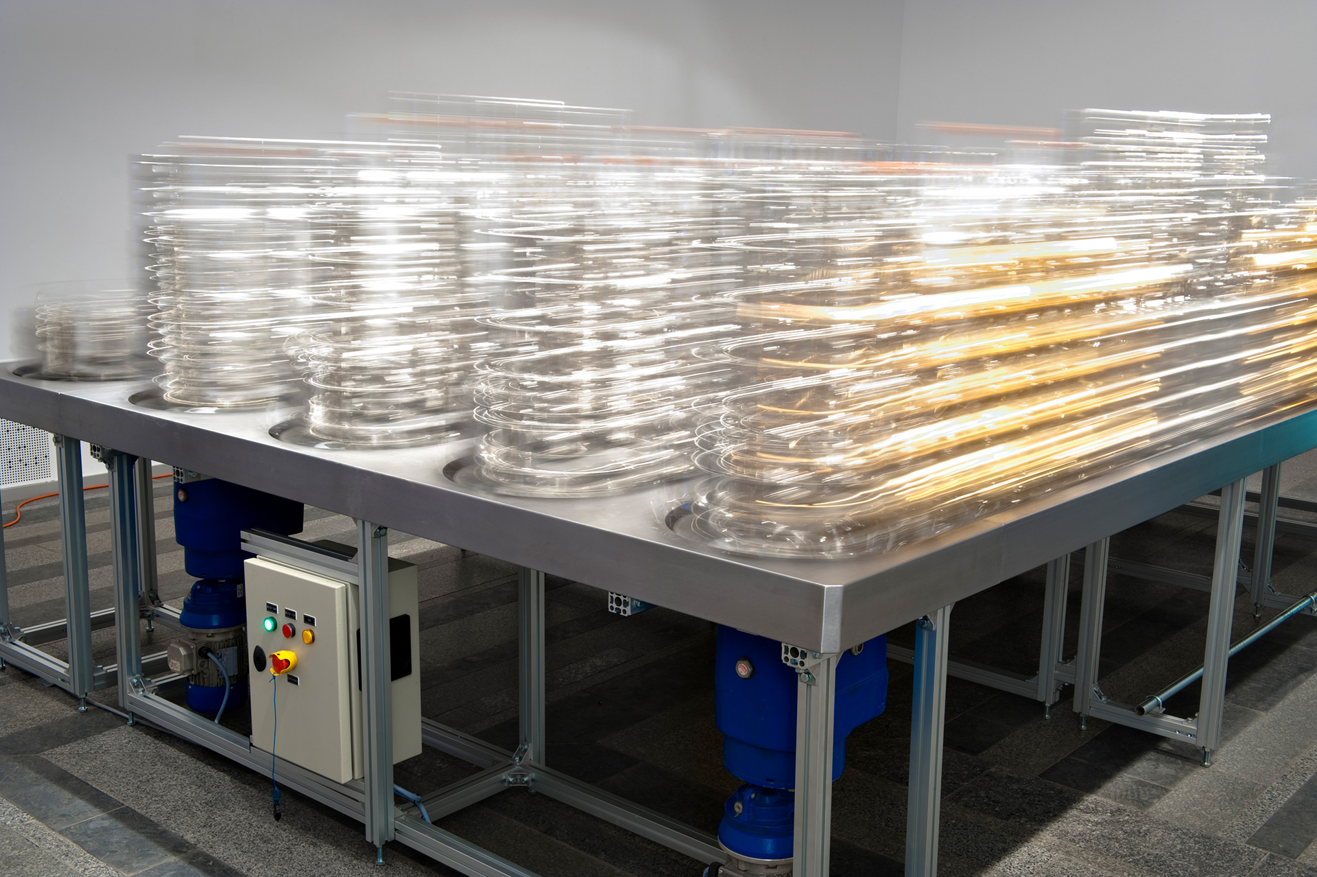The title Faith Matters refers to a central work of the exhibition. The installation, which consists of a moving sushi conveyor belt topped with piles of traditional Indian kitchen utensils, presents what appears to be a metropolis in constant mechanical movement.