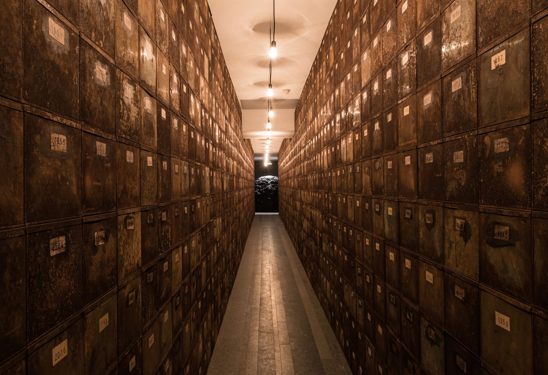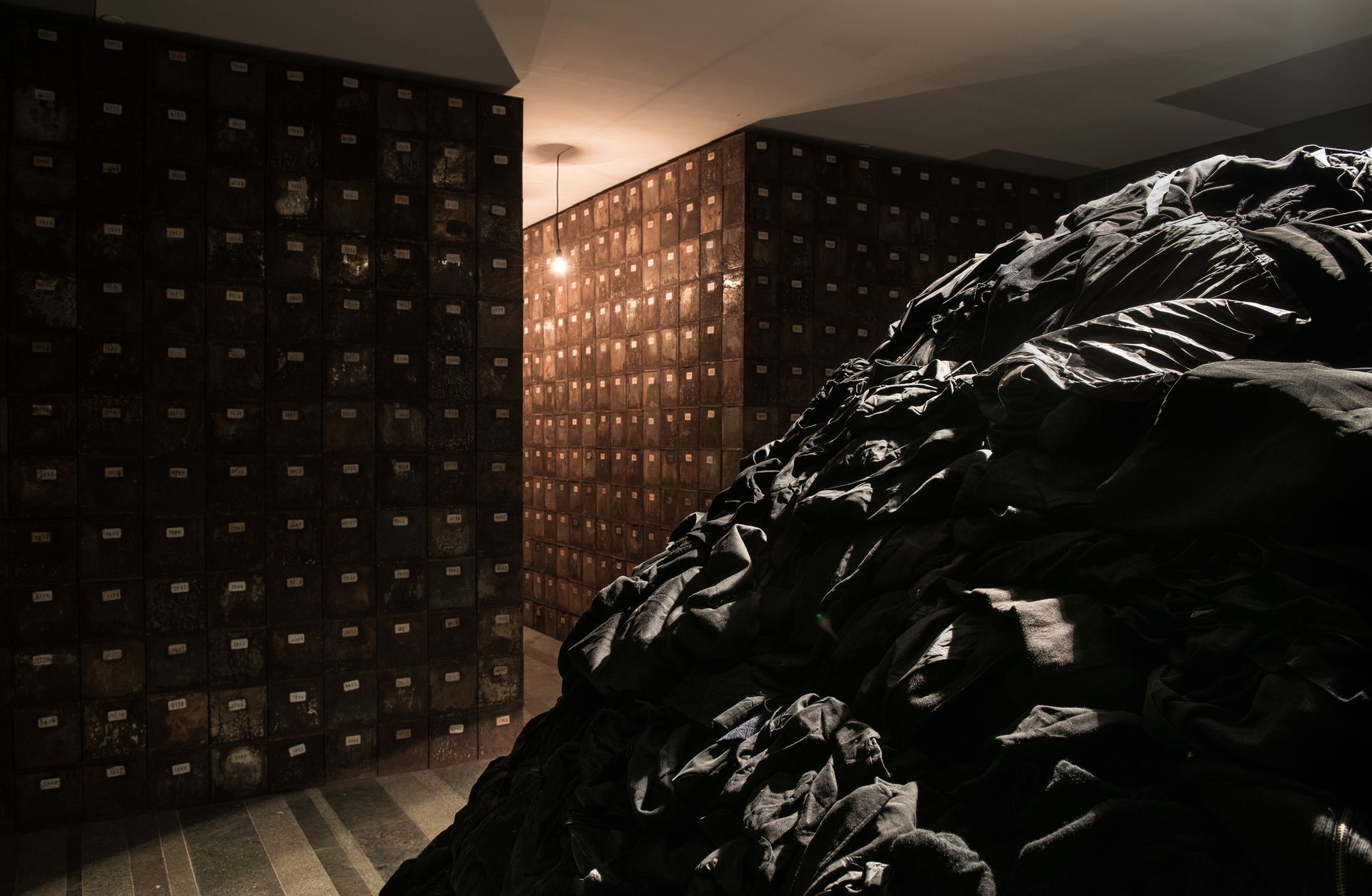 Christian Boltanski created for this exhibition Le Chemin de Babi Yar / The Path of Babi Yar (2016). Hundreds of metal boxes form a long and narrow corridor towards a monumental pile of dark clothes. The boxes, most of them numbered randomly, evoke a chilling relation to funeral urns of unknown persons. They bring to mind the process of killing in Babi Yar where victims brought their valuables and papers (mostly kept in small metal boxes). Once arrived at Babi Yar as an announcement of death, the papers were burned before their eyes.