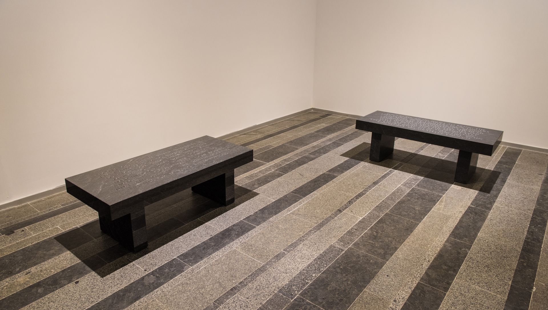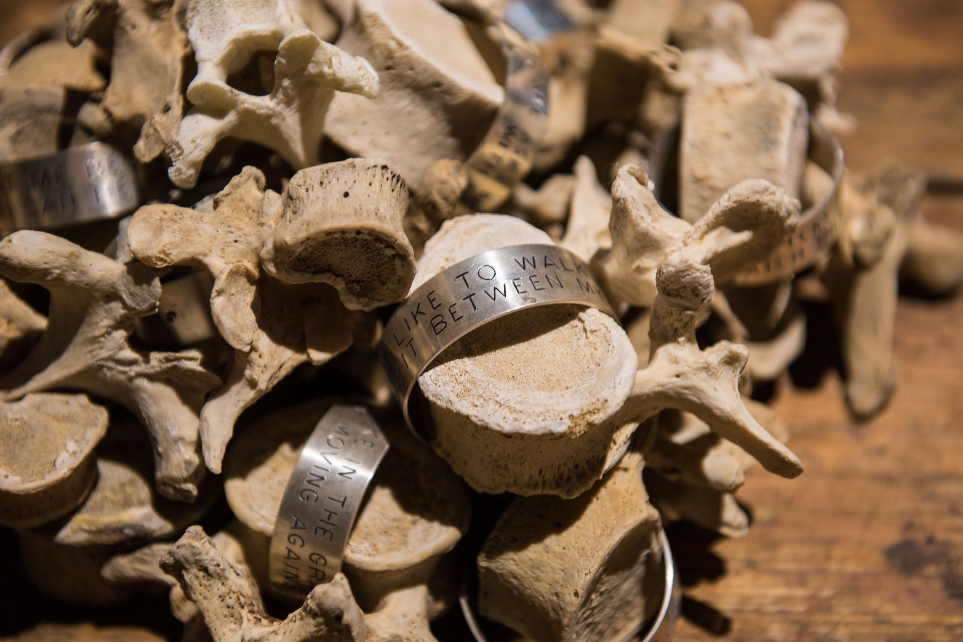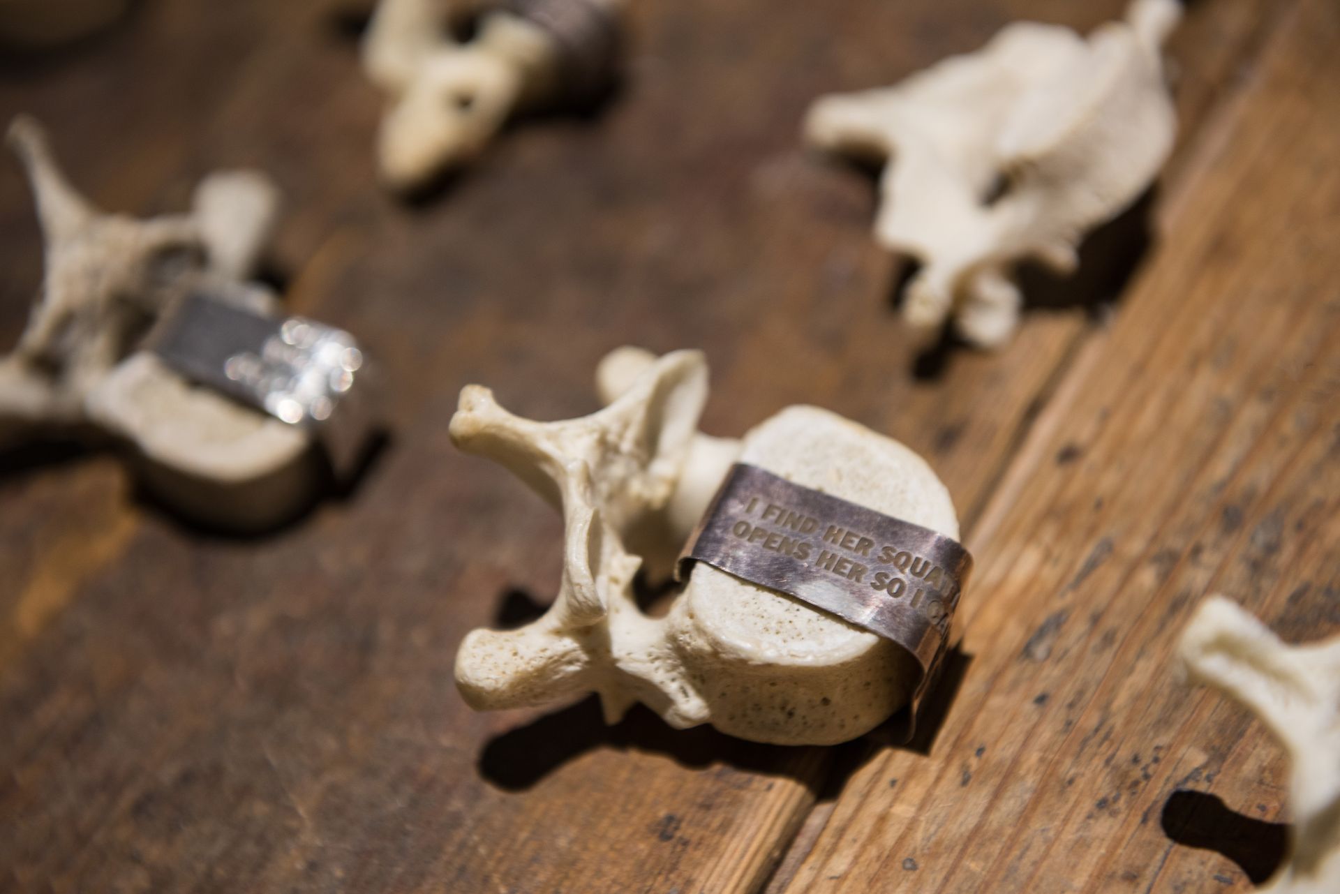 Lustmord Table, (1994) by Jenny Holzer, shows a group of human bones are lying on a wooden table. Some of them carry a silver band engraved with fragments of the text Lustmord. The text itself describes a rape-killing from three different points of view: the victim, the perpetrator and the observer. The work and text were conceived in response to the atrocities during the conflict in the ex-Yugoslavia. Combined with stone benches engraved with texts fragments from Under a Rock (1986), the act of killing itself and the use of violence as a political tool is central to the work. The bronze plaques with texts from the Living Series (1981) and Survival series (1984) ponder on the individual state of mind when confronted with acts of extreme violence. The plaques are combined with the Lustmord Table and Vanwege een Tere Huid III and IV (2016) byBerlinde De Bruyckere.