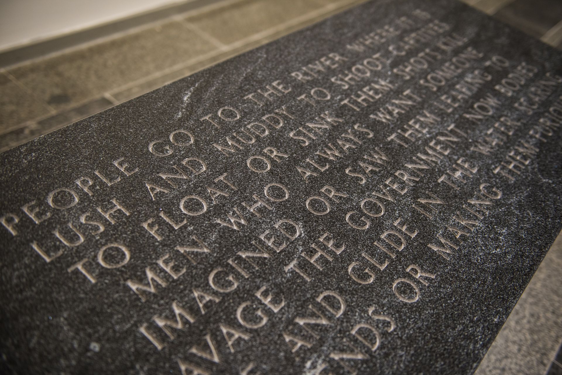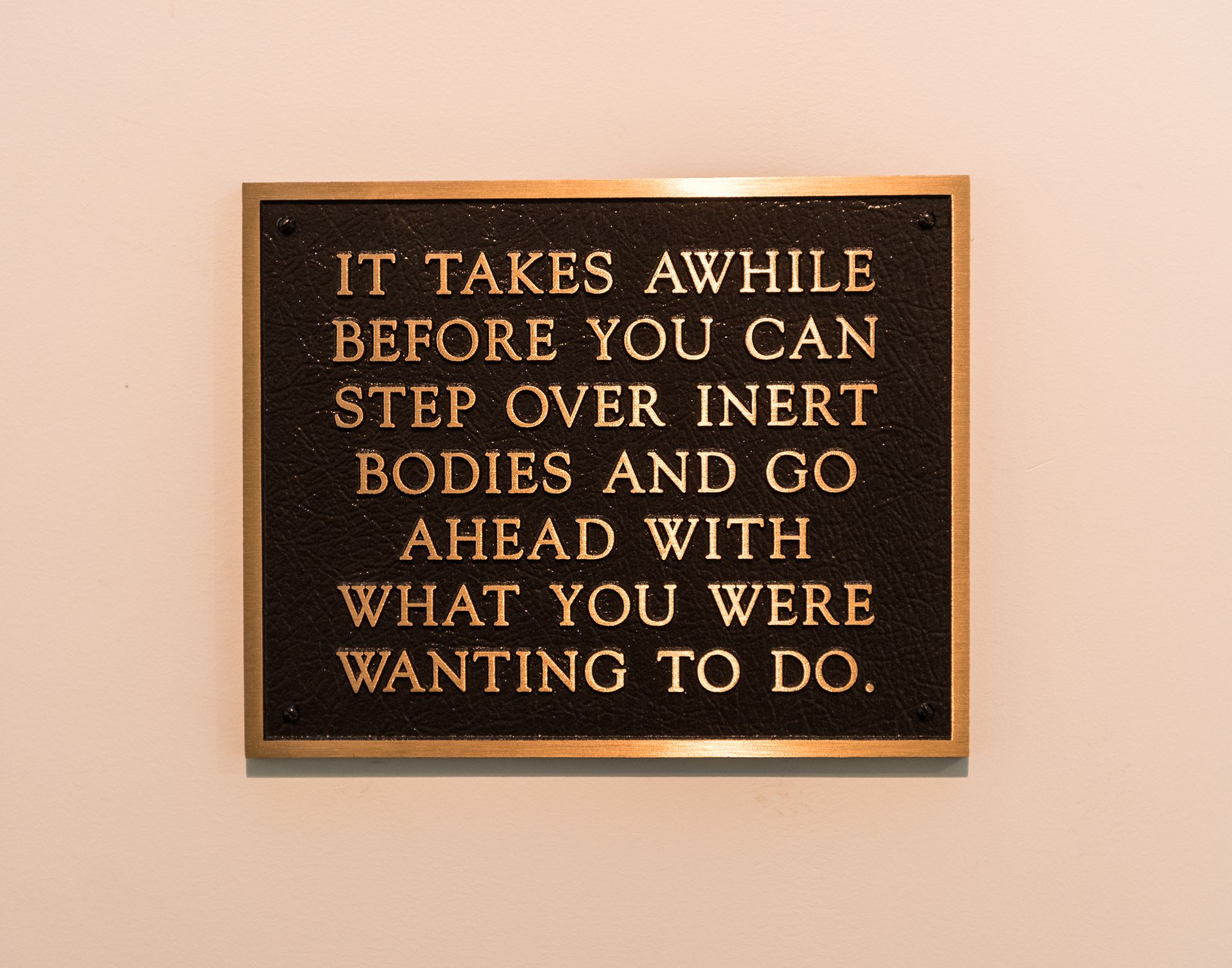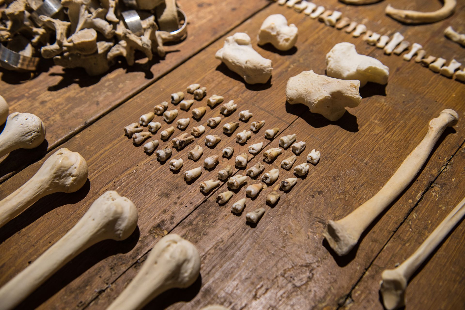 Lustmord Table, (1994) by Jenny Holzer, shows a group of human bones are lying on a wooden table. Some of them carry a silver band engraved with fragments of the text Lustmord. The text itself describes a rape-killing from three different points of view: the victim, the perpetrator and the observer. The work and text were conceived in response to the atrocities during the conflict in the ex-Yugoslavia. Combined with stone benches engraved with texts fragments from Under a Rock (1986), the act of killing itself and the use of violence as a political tool is central to the work. The bronze plaques with texts from the Living Series (1981) and Survival series (1984) ponder on the individual state of mind when confronted with acts of extreme violence. The plaques are combined with the Lustmord Table and Vanwege een Tere Huid III and IV (2016) byBerlinde De Bruyckere.