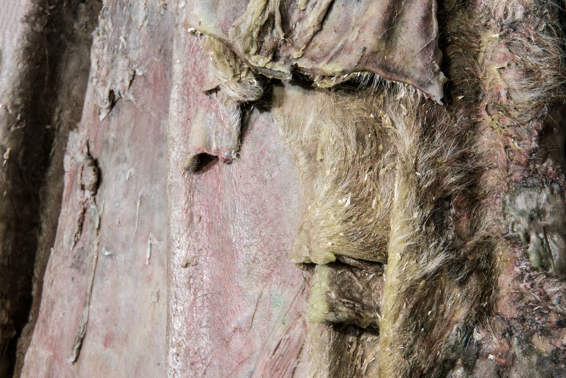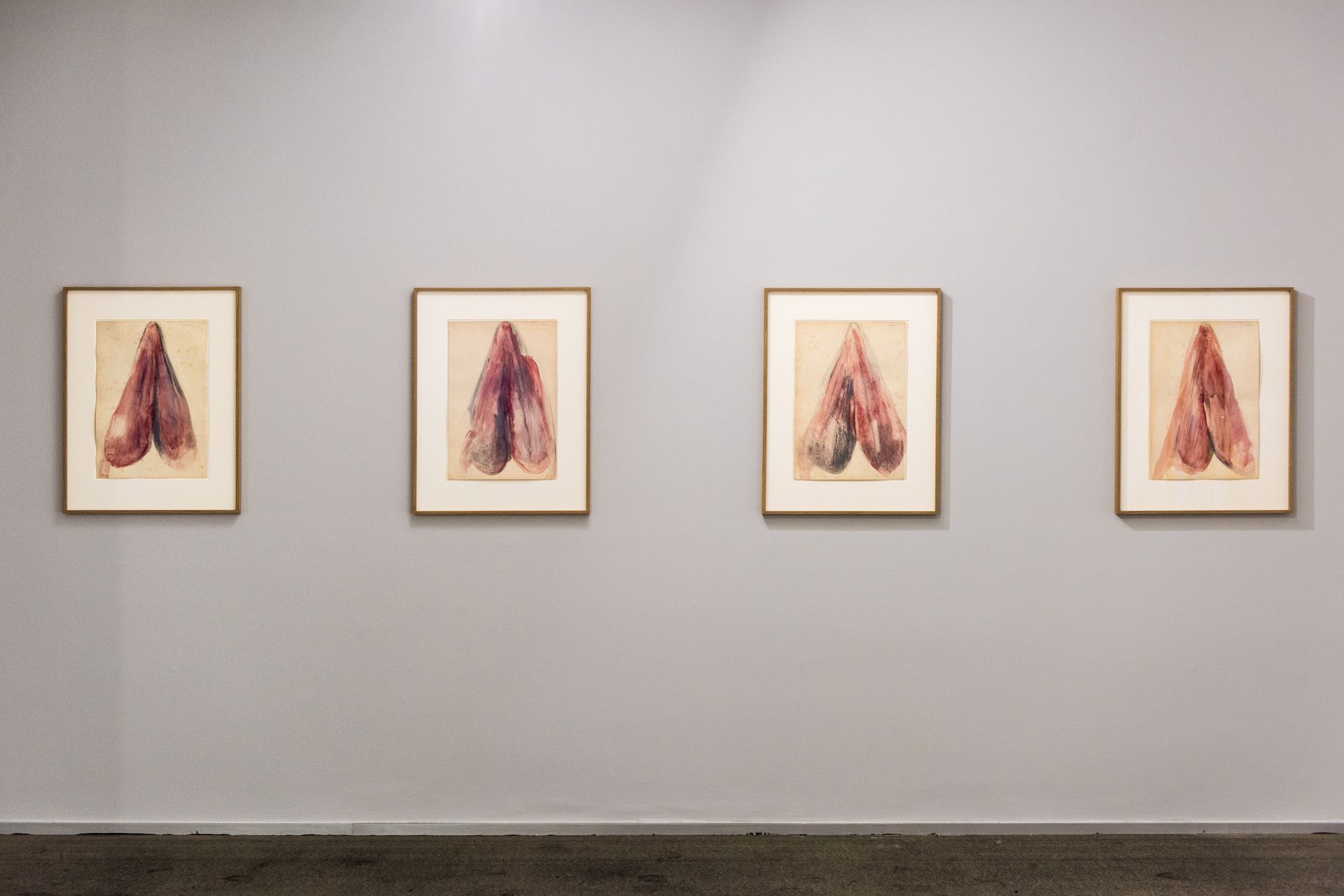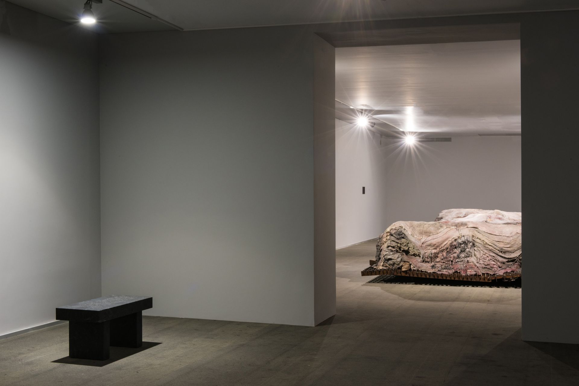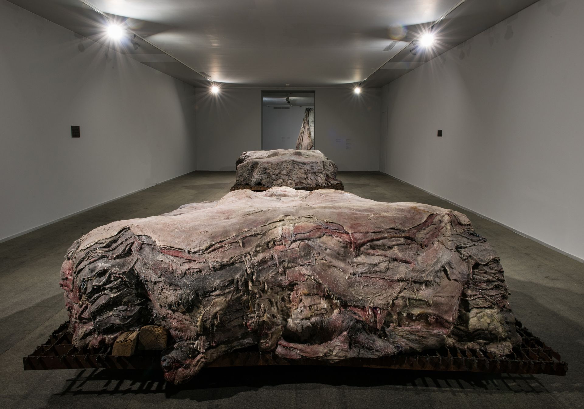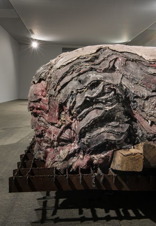 Penthisilea IV, (2016)by Berlinde De Bruyckereshows a fragile skin of flesh-like wax hanging through a rusty hook on a shield-formed steel surface. The confrontation between materials is sexual, harsh and fragile. A sense emphasized in a combination with a series of four drawings calledMet Tere Huid I-IV, (2016). Penthisilea IV proposes a singularity opposed toVanwege een Tere Huid IIIand IV (2016)two monumental sculptures of metal pallets with stacked animal hides (made from wax, polyester, and iron). The initial sculptural form of these works is inspired by observations of the processing of animal hides in a slaughterhouse. De Bruyckere used however a colour palette that replaced sense of the animal hides by that of human skin. And through the sculptural process the layers of skins start suggesting a presence of bodily forms. It brings to mind a landscape of people piled up and molten into each other. Although the image is dark and apocalyptic De Bruyckere speaks of a dying together opposed to a lonely death. It suggests through all the violence, the loss and pain a spark of hope.