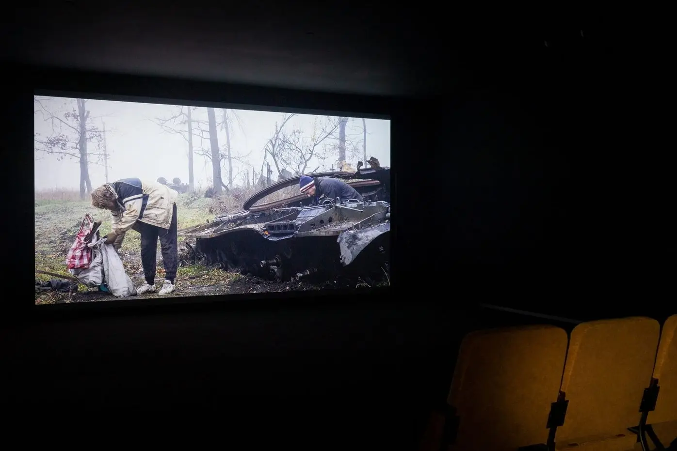 The video shows a field where military vehicles are turning into an integral part of the landscape, with two main characters, impersonated by the artists themselves, wandering around. In the field, they stumble upon a destroyed russian tank and start dismantling its remains to sell them as scrap metal. While doing this, they are whispering prayers asking some abstract supernatural forces to protect them from artillery attacks, mines and other dangers of war.