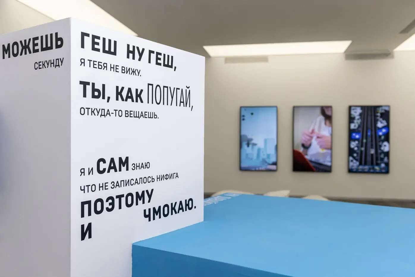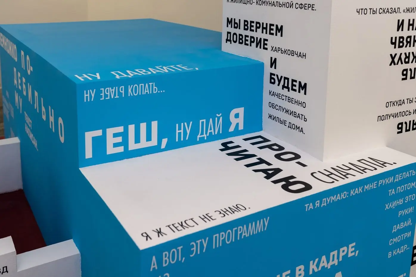 Right across the room from the corner with the TikTok videos, a huge drywall construction is placed; its shape refers to the aesthetics of avant-garde monumental projects. The construction is covered with quotes from the leaked viral video from 2007 showing the Ukrainian politician Mykhailo Dobkin trying to properly deliver his speech for a campaign ad for local elections in Kharkiv, with his political ally Hennadiy Kernes brutally instructing him from behind the scenes. In the installation, the artist juxtaposes an absolutist maximalist utopian idea of how politics should be made with the actual reality of politics.