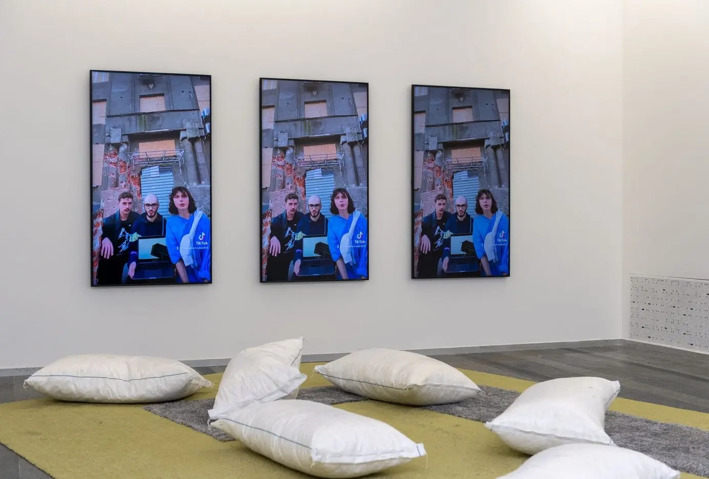 The artist invites the visitor to lay back and dive in the stream of TikTok videos with references to Ukrainian avant-garde practices. The videos were mostly shot in Kharkiv’s ‘Slovo’ House, which was an important cultural centre in the 1930s for Ukrainian avant-garde artists, the majority of whom were eventually repressed during the Stalinist era. For this work, Khodak invited two TikTokers to Kharkiv to participate in the rebuilding of the city and create video content on-site, under virtually constant missile and artillery shelling. In an attempt to revive the broken tradition of Ukrainian Modernism, the artist asked the TikTokers to live in the ‘Slovo’ House for several days and to speculate together about the new post-war utopian country.