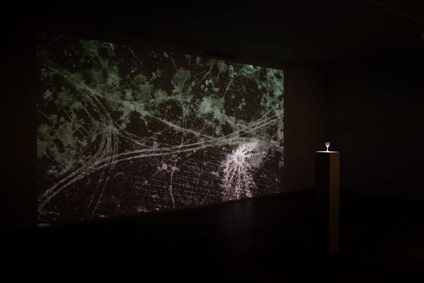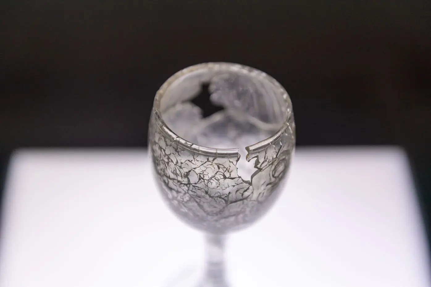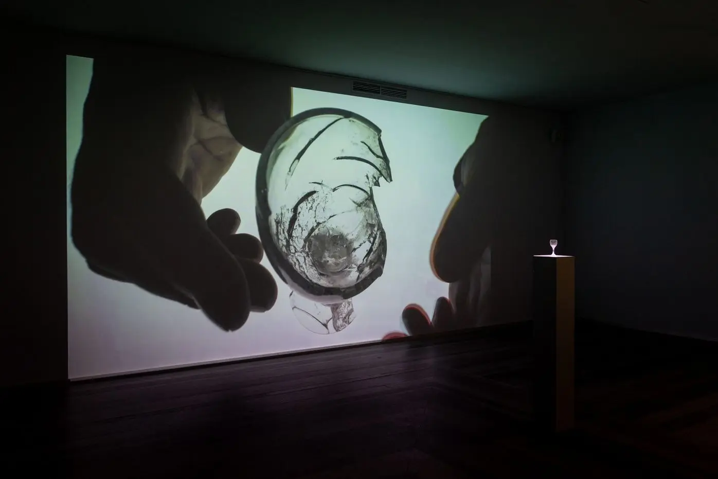 The video shows a close-up of restoration of a crystal glass carried out by meticulous gluing of its shards back together. The final product, i.e. the restored glass, is showcased in an illuminated pedestal in the centre of the exhibition space. Even though it might look like a practically usable item, its surface is still covered with cracks, which makes it more of an artefact holding memory of the war than an actual piece of glassware.