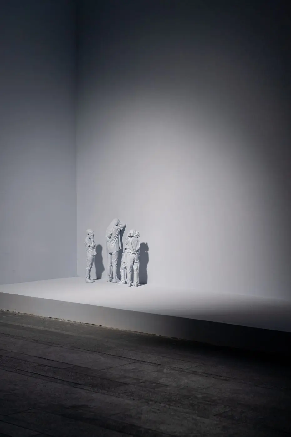 Nikitina’s new work is a sculpture depicting four kids playing hide-and-seek. Three of them are covering their eyes with their hands and facing the wall, while the fourth kid, a little boy, is discreetly peeping at the viewer. These kids are Ukrainians who were forced to flee their homes after the full-scale war broke out, and now live in Brno, Czech Republic. They are labelled as refugees, but they refuse to call themselves that and rather perceive the whole situation as a sort of a temporary game where they have to keep counting months and wait to come back to Ukraine. In this game, they are not hiding but seeking.