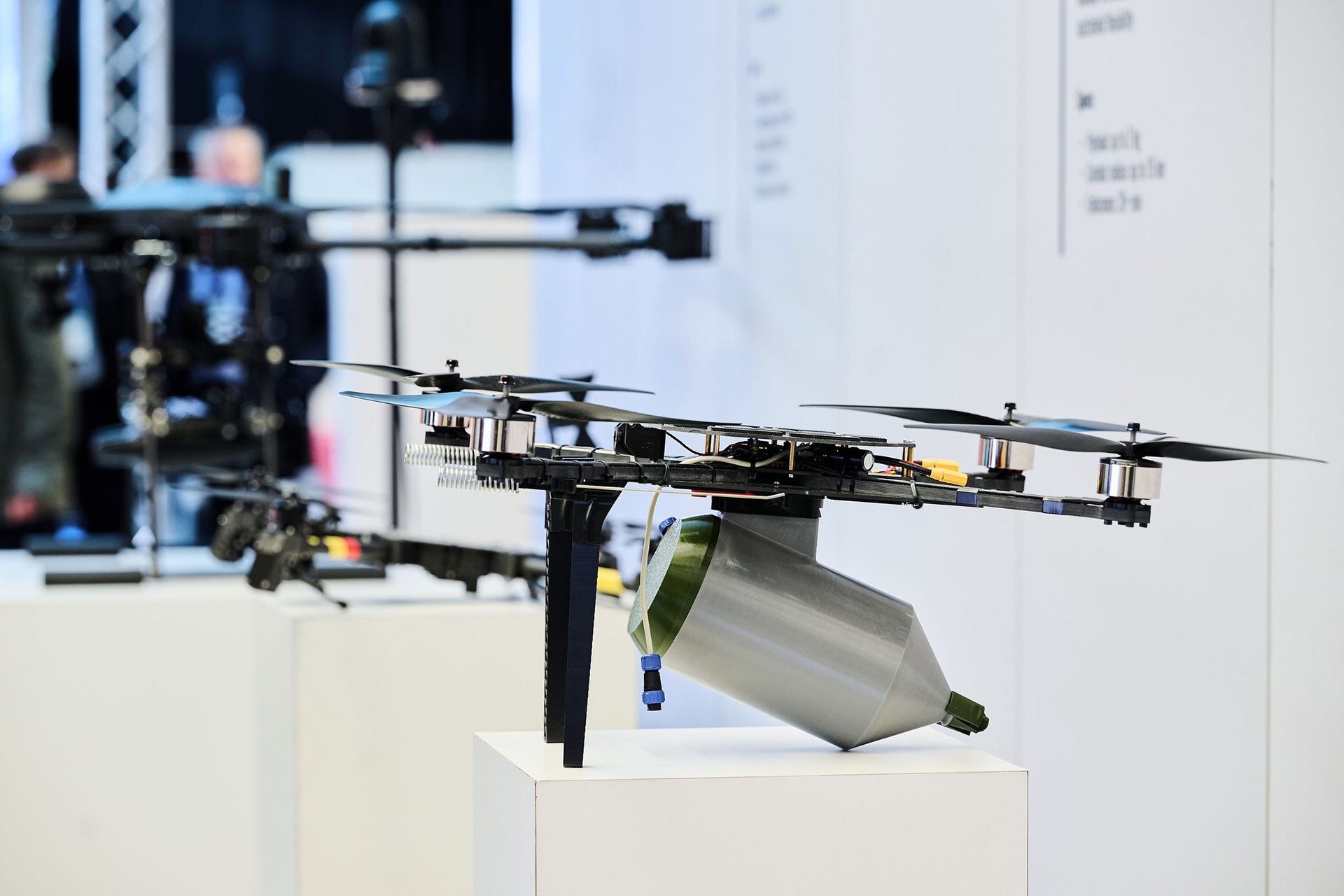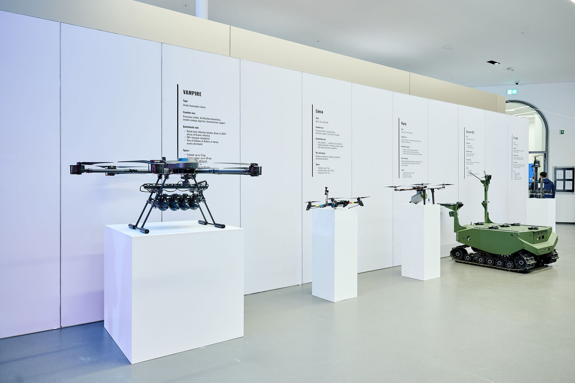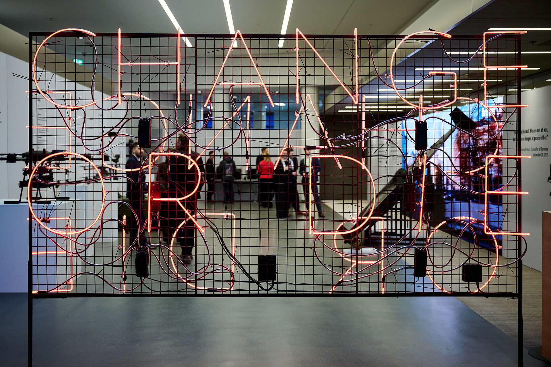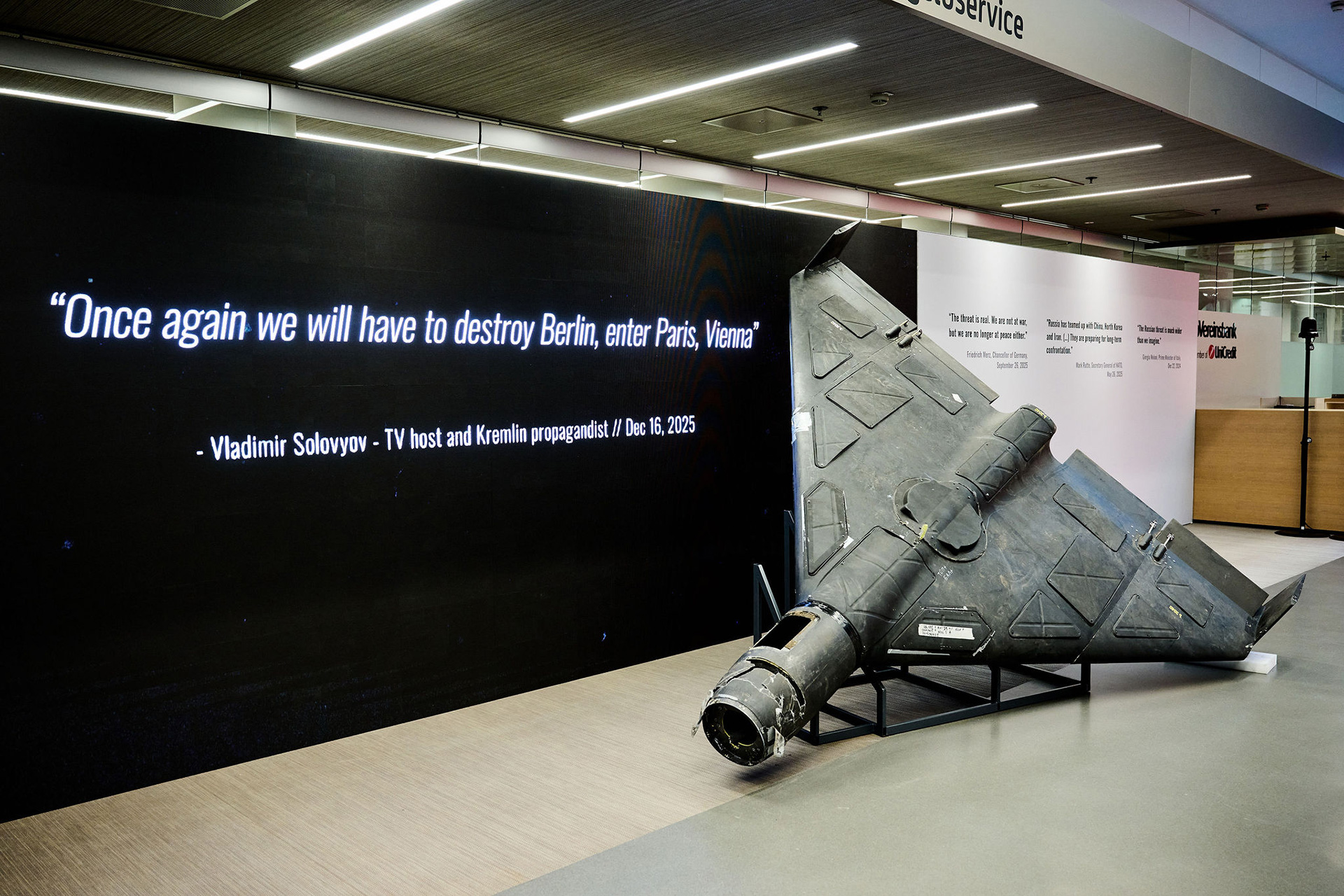 Центральним елементом експозиції є фільм, згенерований за допомогою ШІ, який моделює атаку дронів на столиці європейських держав. Водночас перед екраном представлено реальний збитий «шахед» — приклад дронів, які щодня вбивають українців. Поруч демонструються українські інноваційні системи, які донині стримують загрозу війни для Європи. Яскравий неоновий напис у просторі виставки — «Change or Die» («Змінюйся або помри») — звучить як сигнал для пробудження Європи та Заходу.