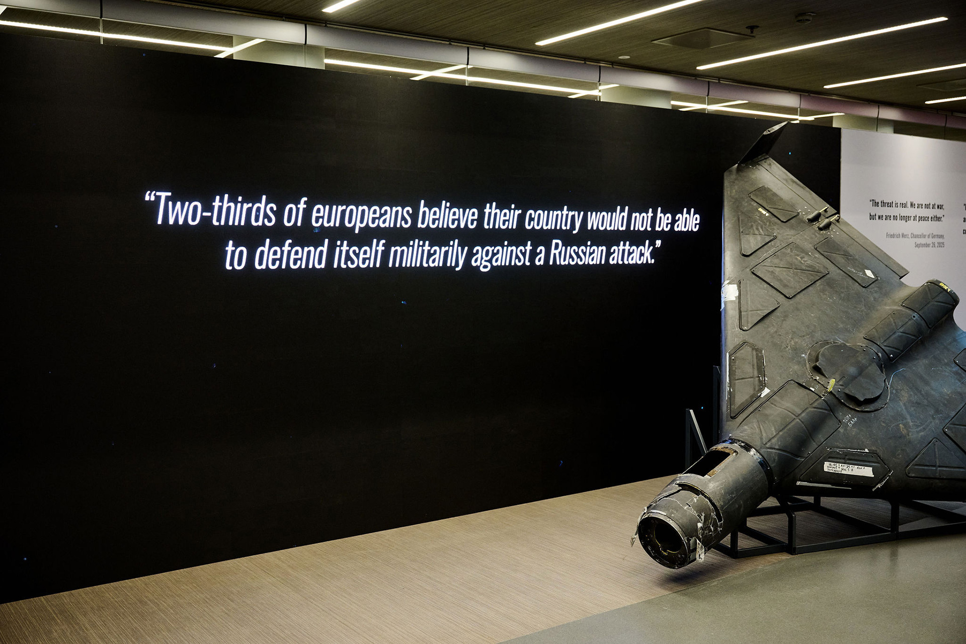 ШІ-фільм, що демонструє можливий сценарій майбутнього для Європи: атаку російських дронів на столиці країн Європейського Союзу. Перед екраном — реальний збитий «шахед».