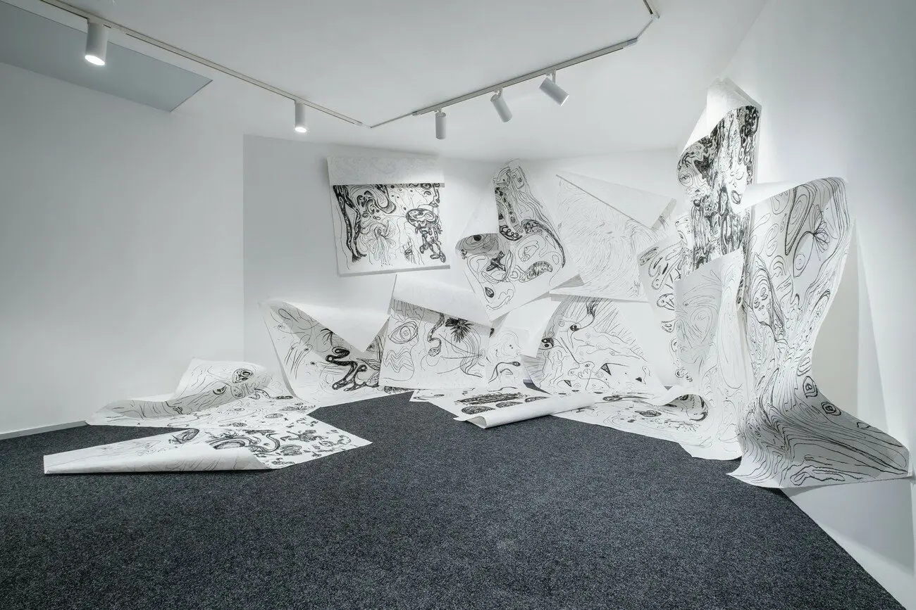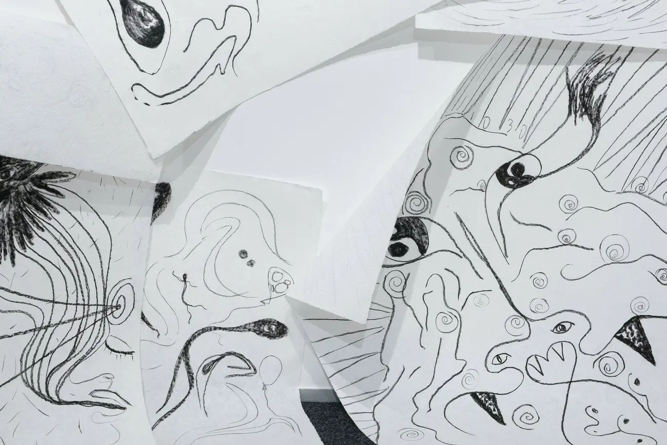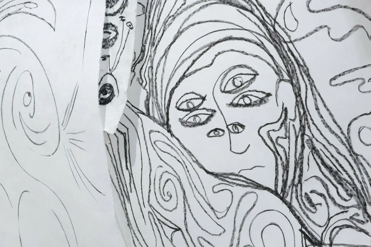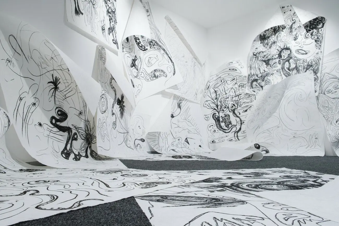 Taypi (тайпі), 2020 Інсталяція з 15 малюнків сухою пастеллю на папері ручної роботи, запис звуків еолової арфи. Створено за підтримки PinchukArtCentre