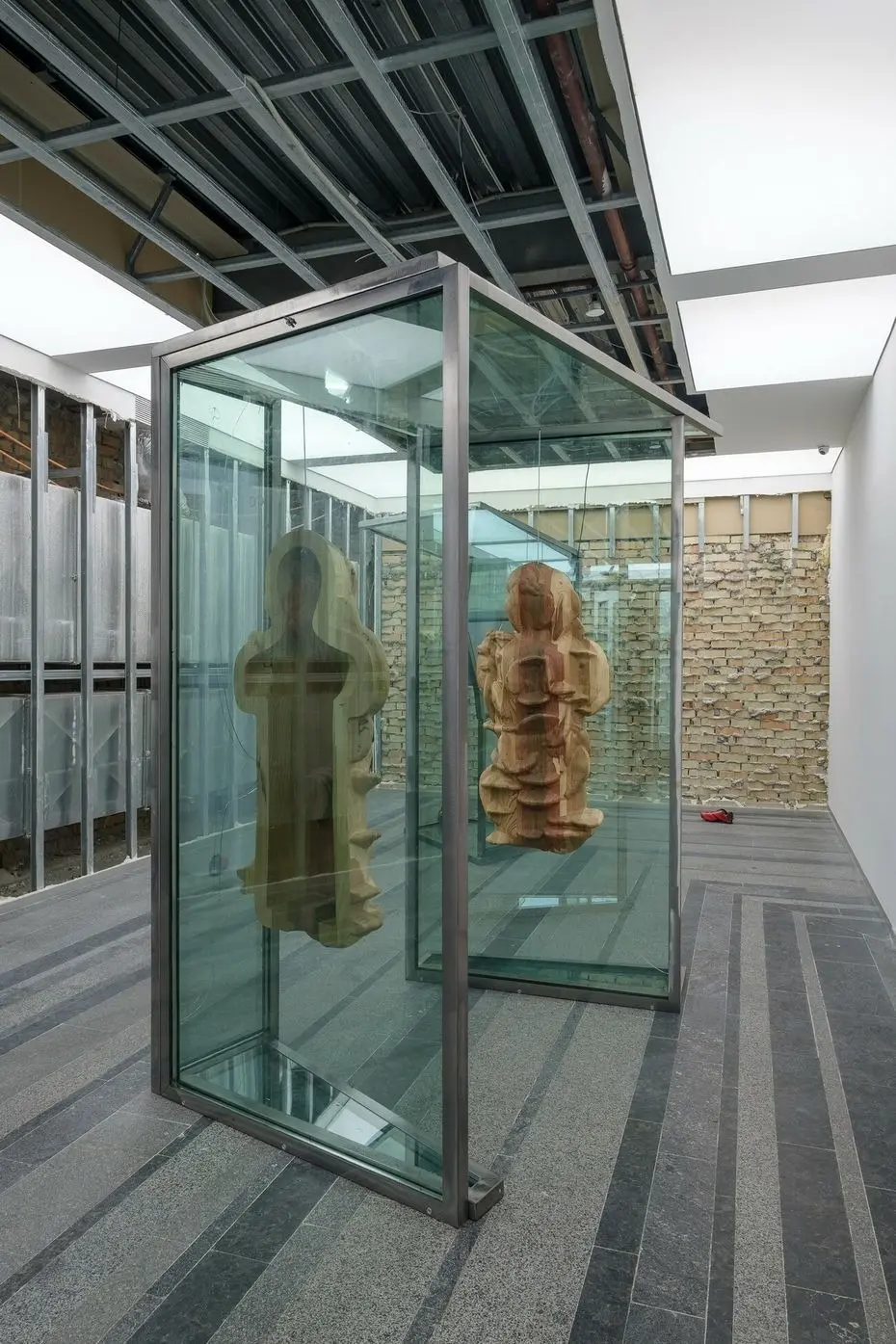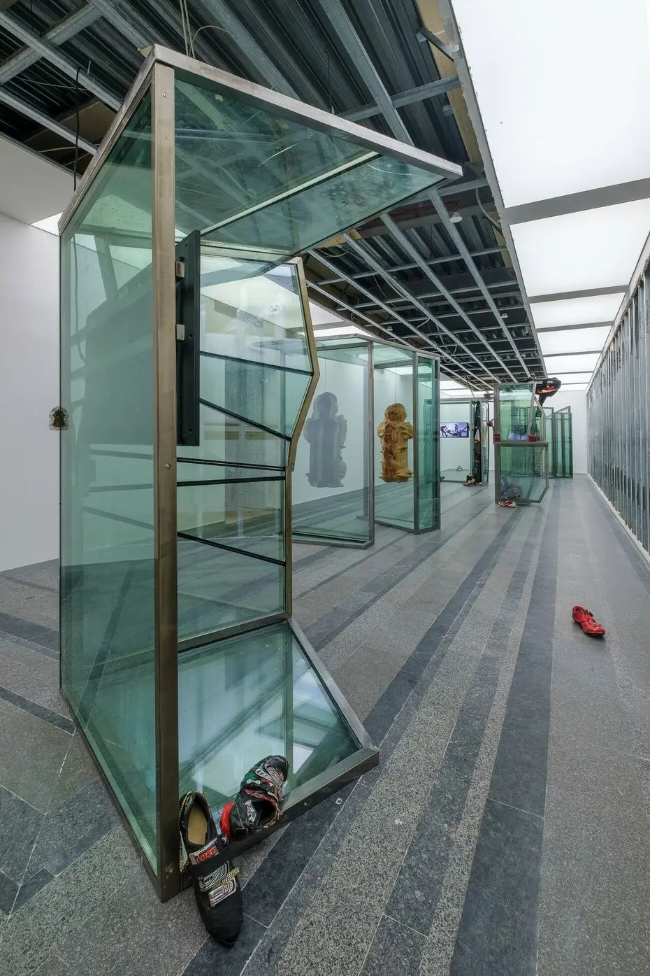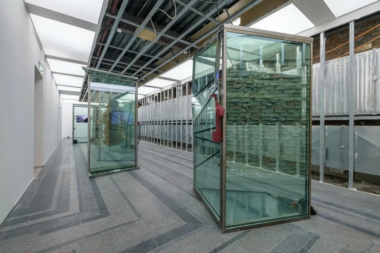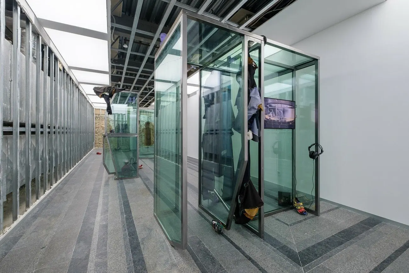 Рятувальні манекени, 2021 Знайдені вікна з офісної будівлі, багатоканальне відео, звук, дерев’яні скульптури, бронзові скульптури, жалюзі, одяг, взуття, збруя, світло. Створено за підтримки Lafayette Anticipations, Berthold Pott Gallery, Cite International des Arts та PinchukArtCentre