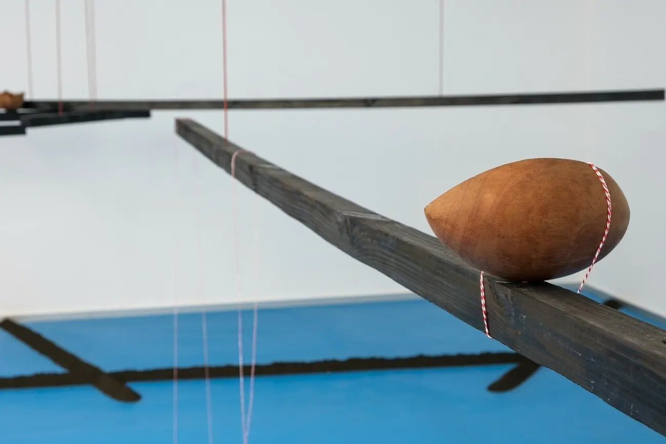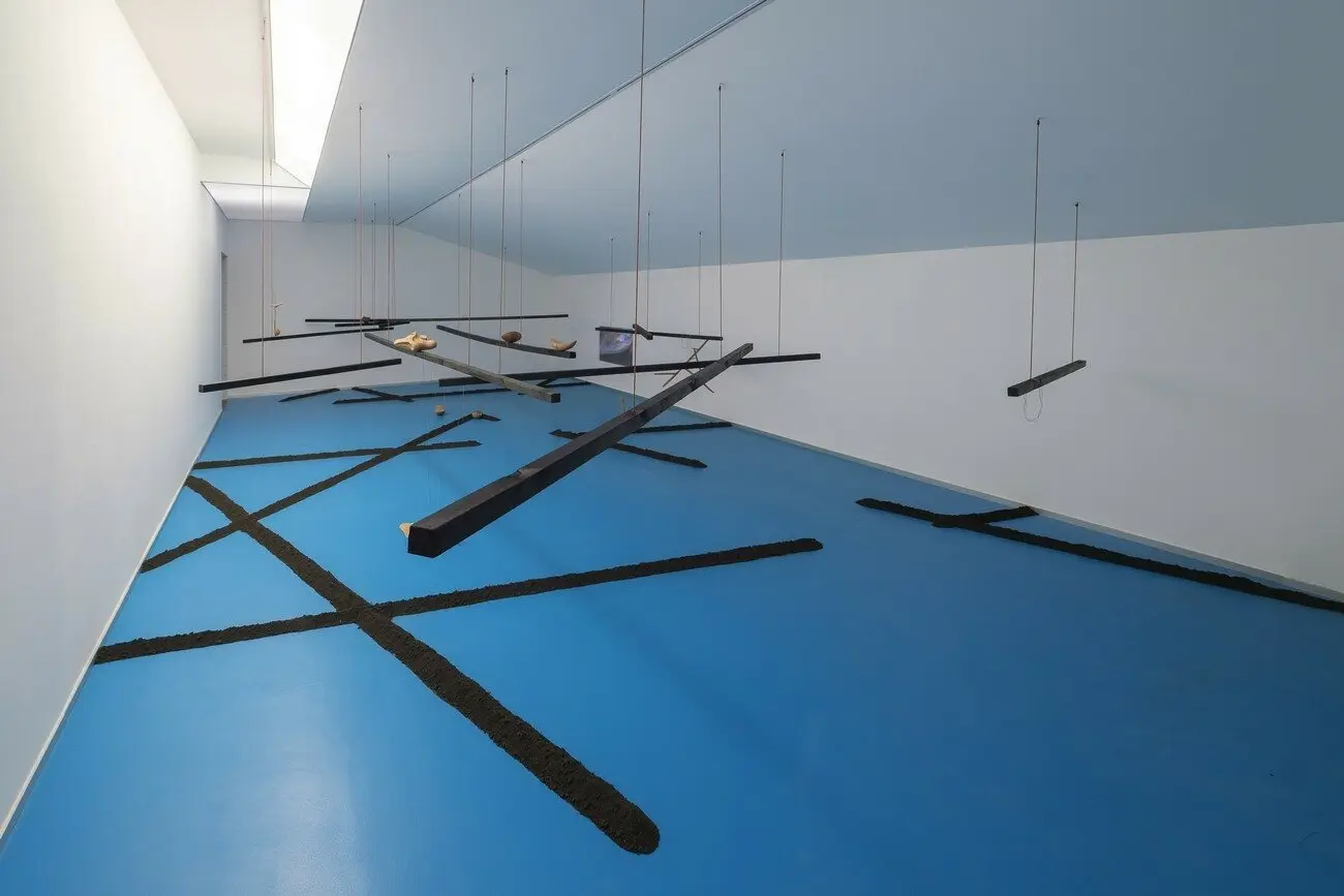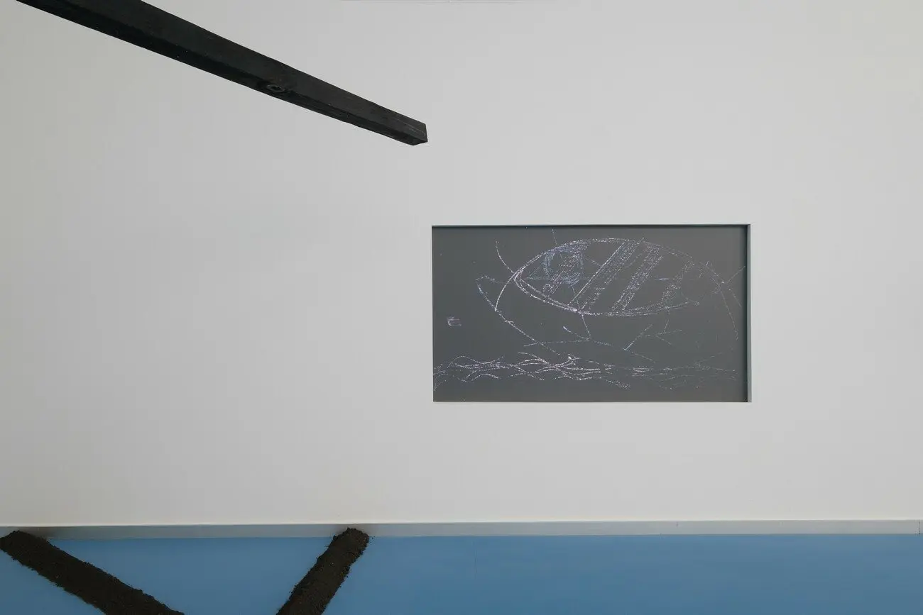 Довжина мого погляду вночі, 2021 Малюнок на землі, скульптури з дерева, конструкція з випаленої деревини, нитки, відео. Створено за підтримки PinchukArtCentre