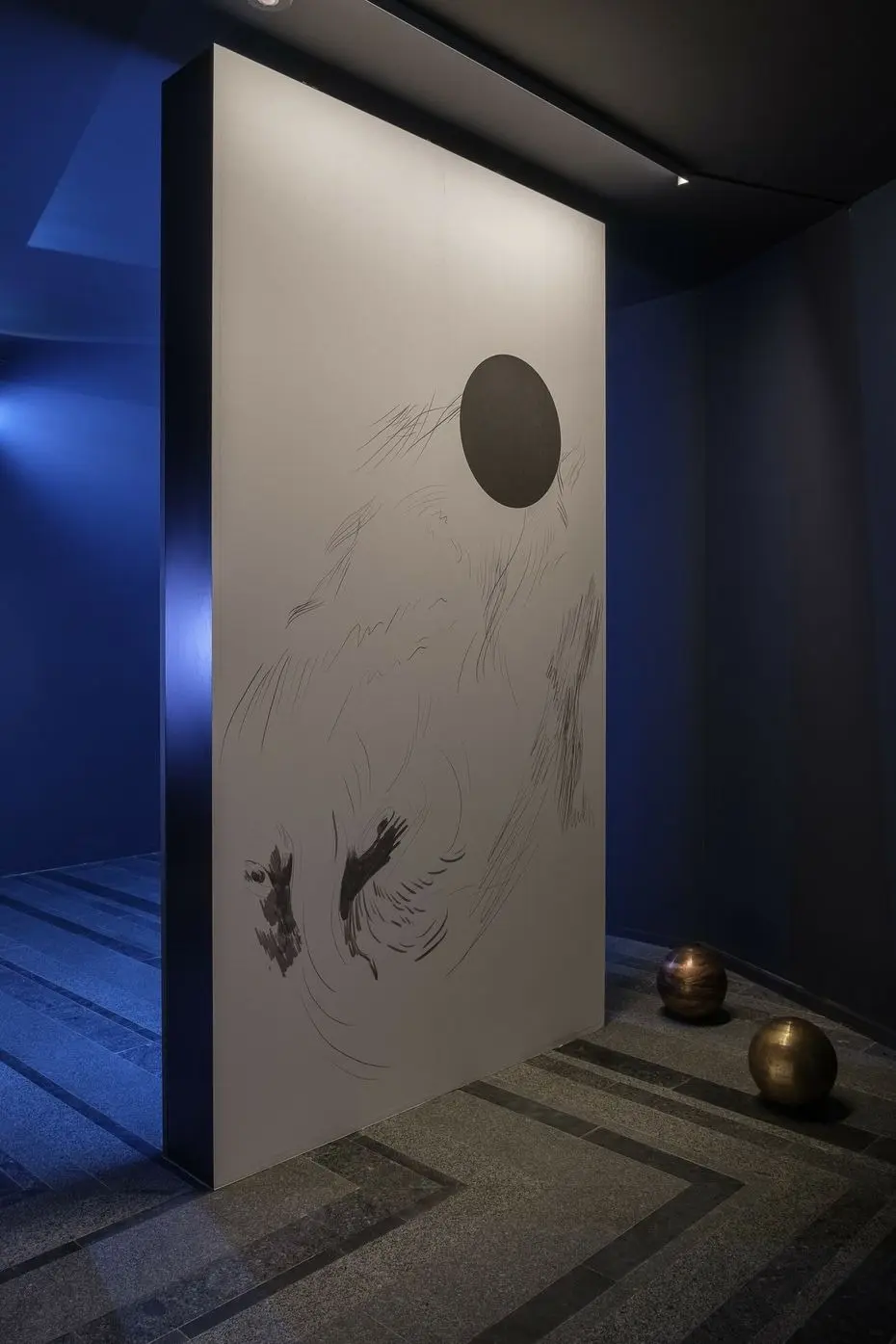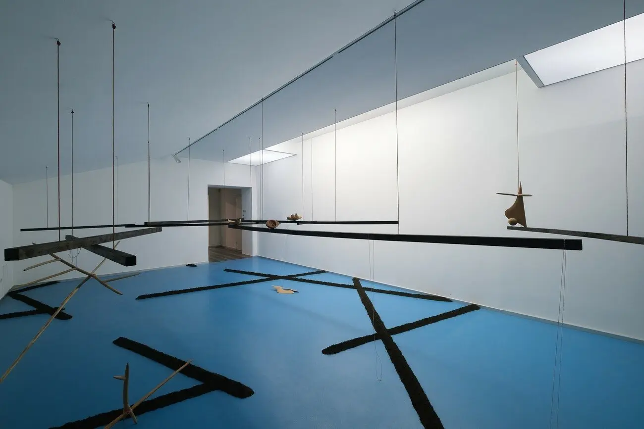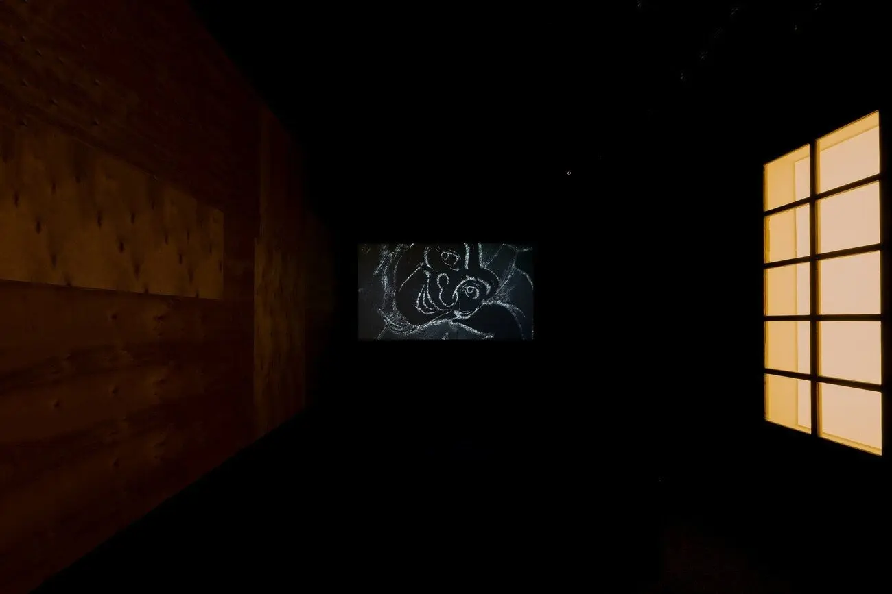 Довжина мого погляду вночі, 2021 Малюнок на землі, скульптури з дерева, конструкція з випаленої деревини, нитки, відео. Створено за підтримки PinchukArtCentre