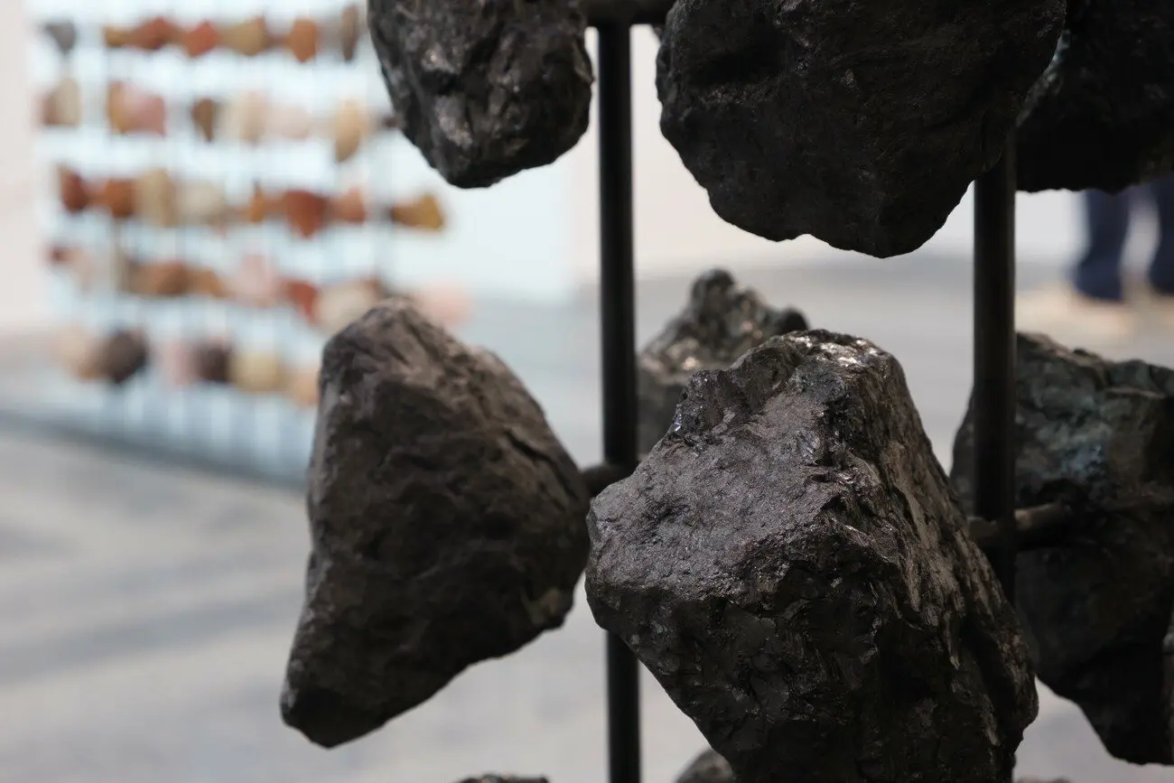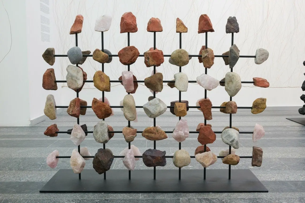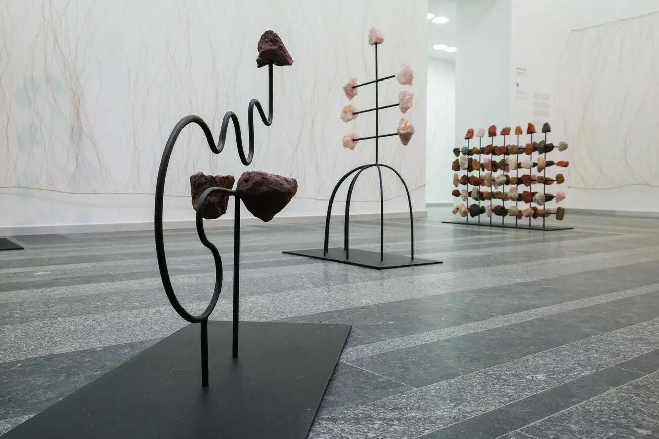 /xabi, 2021 Каміння з плато Hoerikwaggo, річкове каміння, залізна руда, яшма, вугілля, рожевий кварц, м’яка сталь, вуглецева сталь з мідним покриттям, шпагат з конопель, звук. Надано художницею