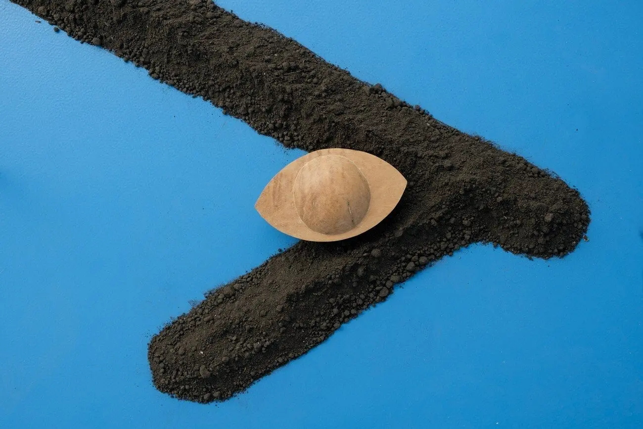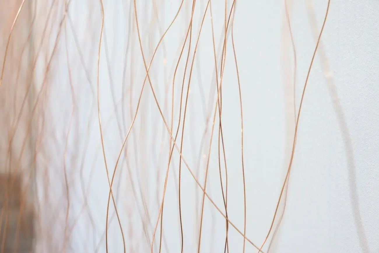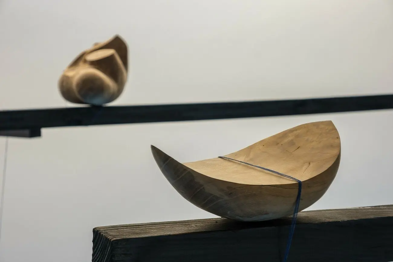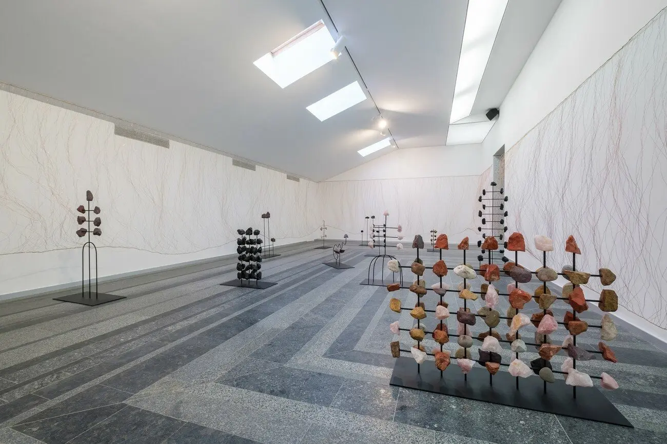 /xabi, 2021 Каміння з плато Hoerikwaggo, річкове каміння, залізна руда, яшма, вугілля, рожевий кварц, м’яка сталь, вуглецева сталь з мідним покриттям, шпагат з конопель, звук. Надано художницею
