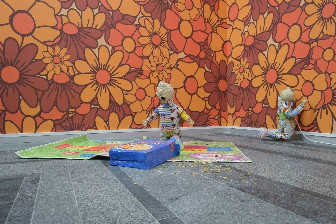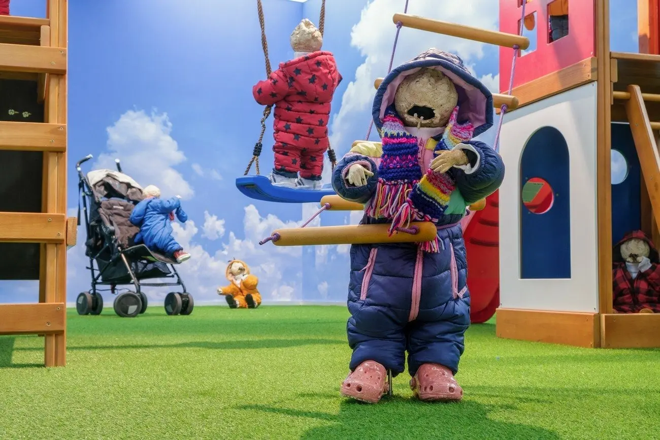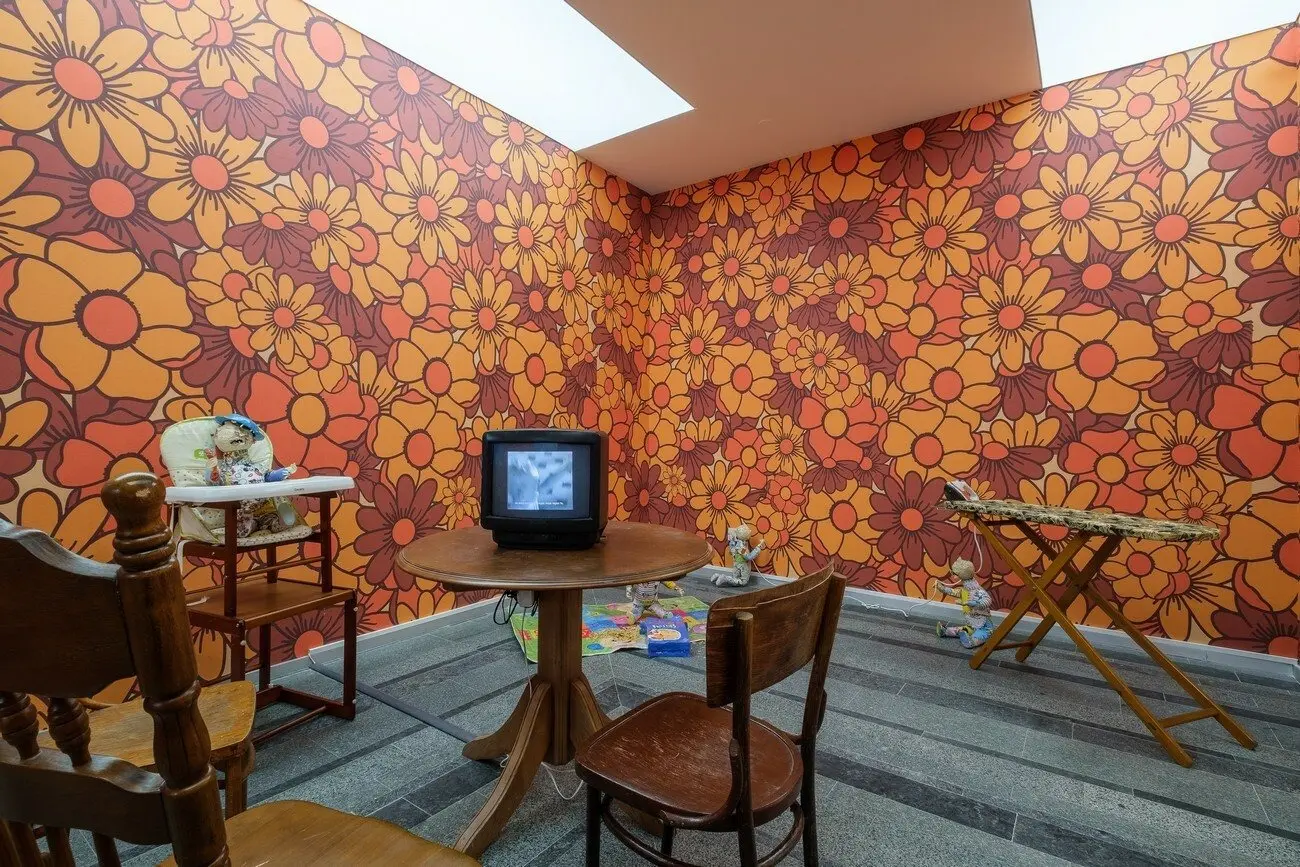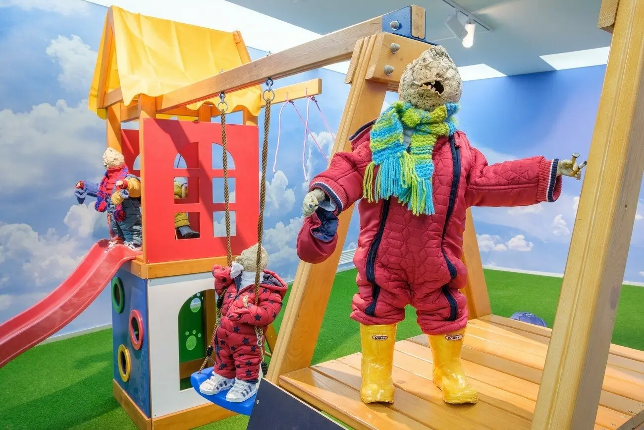 Не можу відвести від тебе очей, 2021 Інсталяція з 16 керамічних скульптур, дитячий майданчик, меблі, шпалери, відео 10’. Створено за підтримки PinchukArtCentre