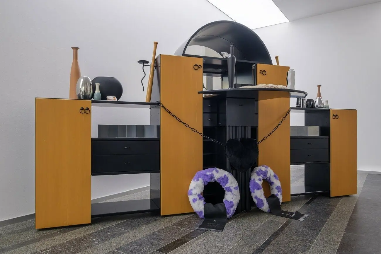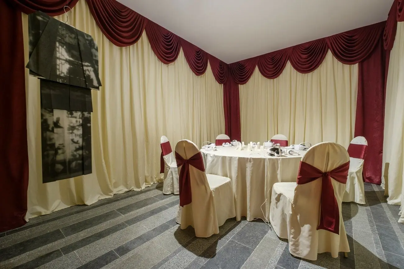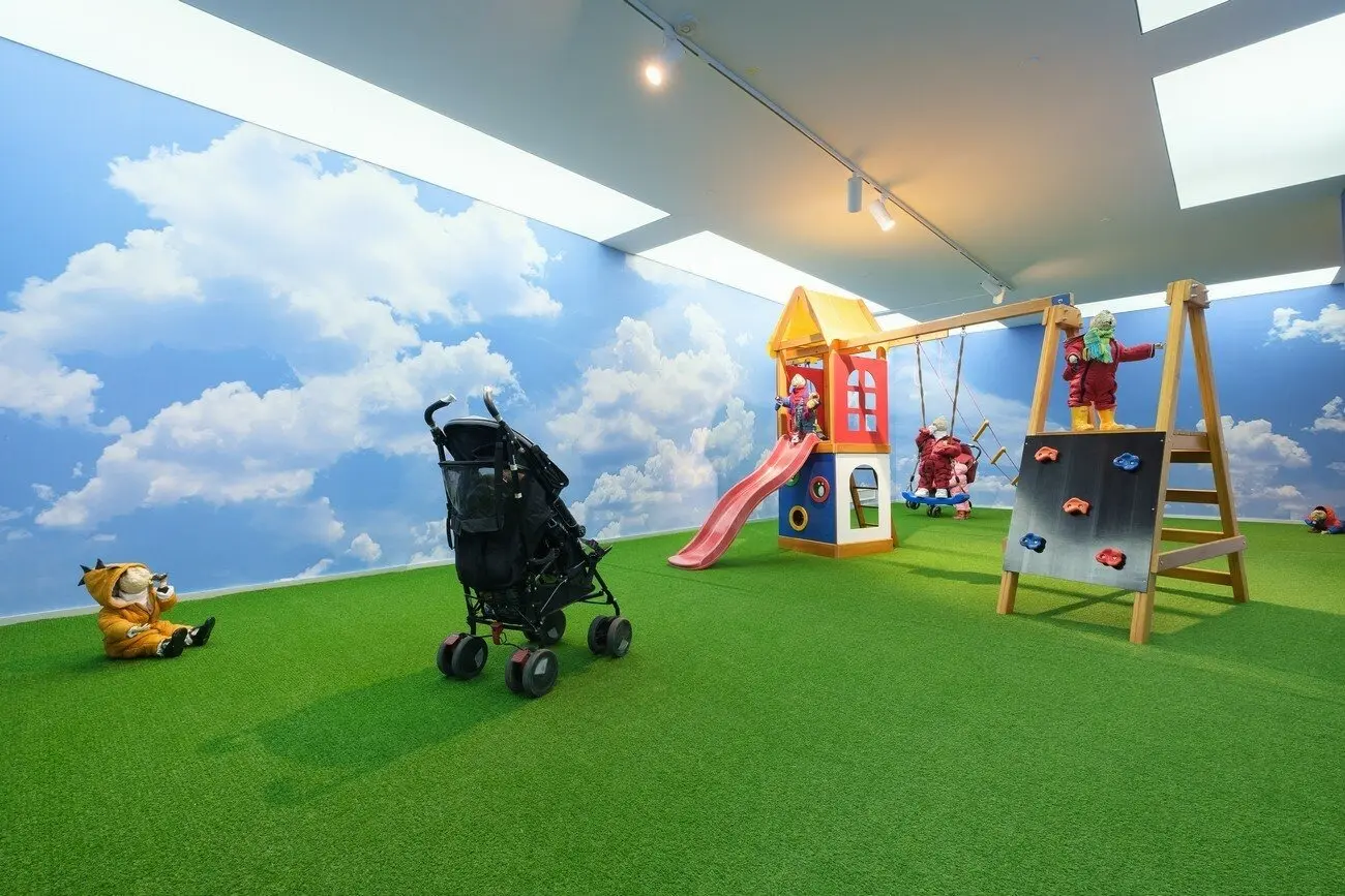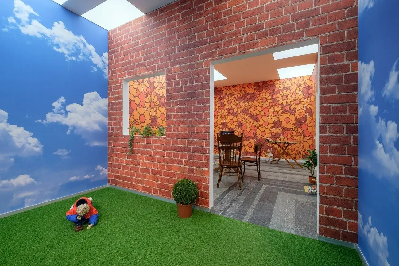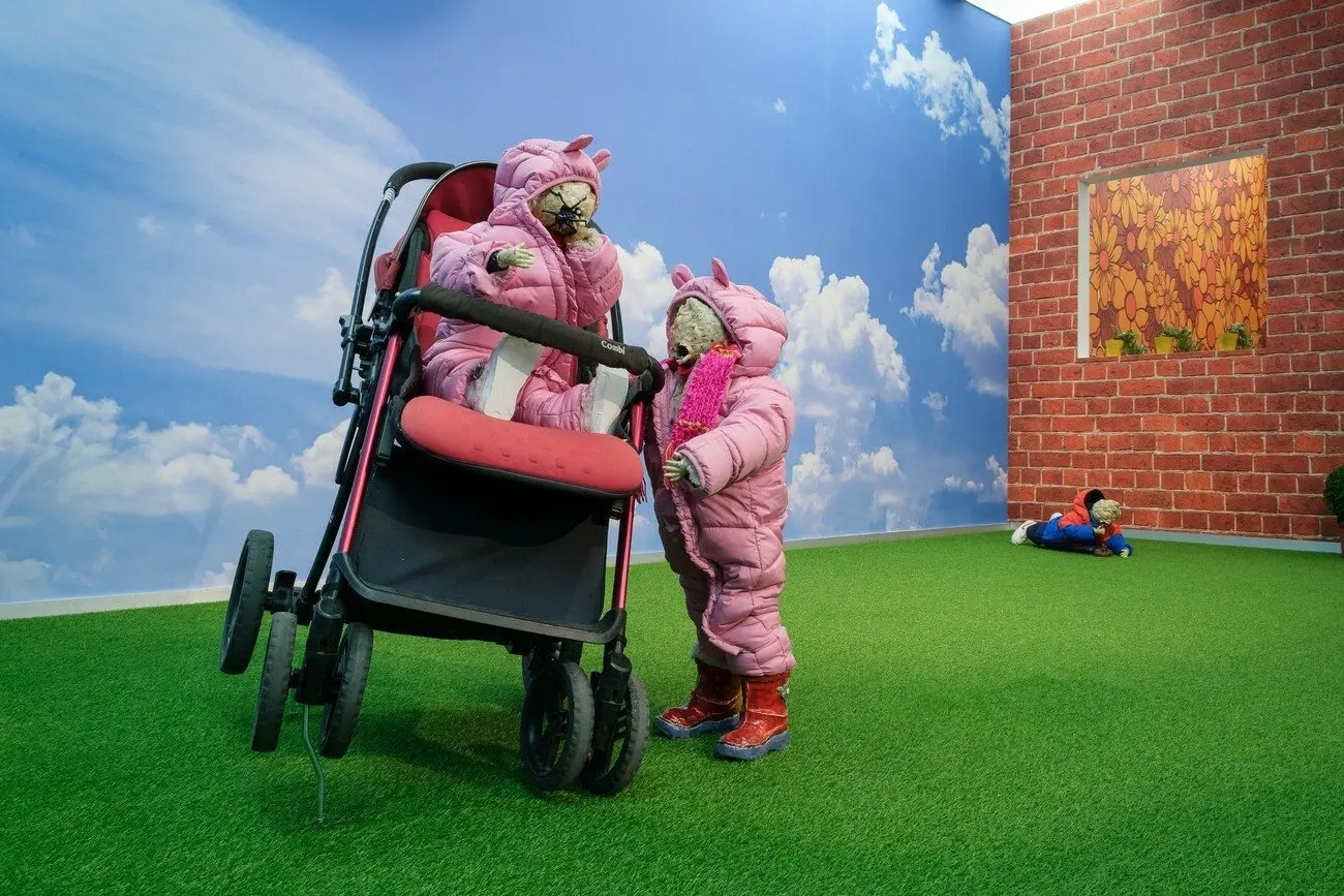 Не можу відвести від тебе очей, 2021 Інсталяція з 16 керамічних скульптур, дитячий майданчик, меблі, шпалери, відео 10’. Створено за підтримки PinchukArtCentre