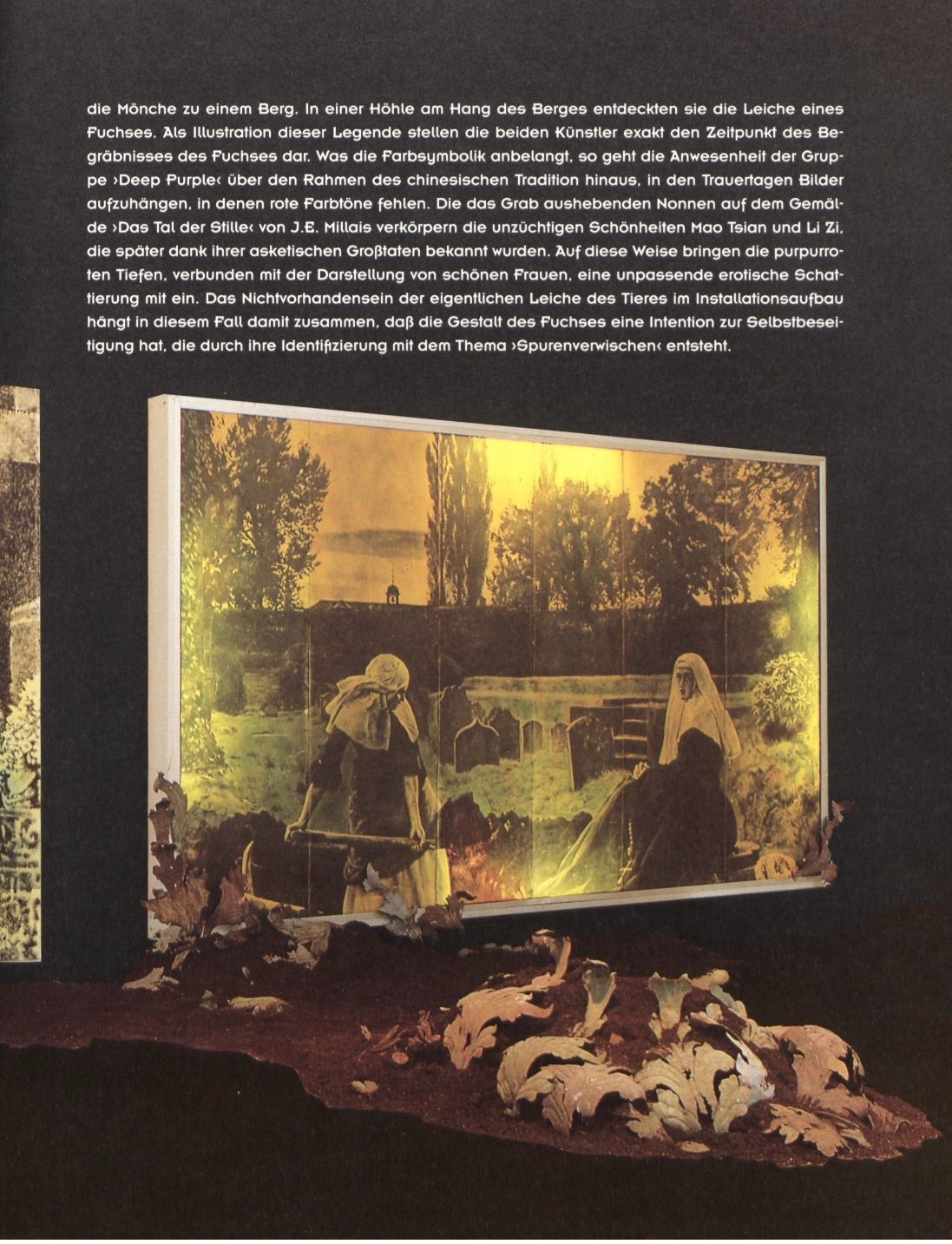 нсталяція cкладається з двох великих фотографій (одна з яких у лайтбоксі) та землі з листям, що лежить на підлозі перед ними. В основу роботи покладено одноіменну чань-буддійську притчу Умень Хуейкая. В ній йдеться про те, як після проповіді до монаха Байчжана приходить старець, якого нібито перетворили на лиса на п’ятсот перероджень за неправильну відповідь на питання. Спілкуючись з Байчжаном, він отримує просвітлення та стверджує, що тепер звільнився від лисячого обліку і просить поховати його тіло за чернечим чином. Отже, монах та його учні ховають тіло лиса. Інсталяція відноситься як раз до моменту поховання. Усі три елементи інсталяції стосуються даної теми. На одній з фотографій зображено учасників гурту Deep Purple, імовірно складу 1970-х років (з ліва направо: Гіллан, Лорд, Гловер, Блекмор, Пейс), на кладовищі Фрідріхсвердершер, у берлінському районі Кройцберг (остання ілюстрація – фото, що було виконано, імовірно, в той же день, що й фото, задіяне в інсталяції). На лайт-боксі представлена репродукція однієї з останніх прерафаелітських робіт Джона Еверетта Мілле (1829–1896) «Долина покою» (1859), на якій зображено двох монахинь на огородженому церковному кладовищі. Одна з них проникливо дивиться на глядача, в той час як друга старанно розкопує могилу. Не дивлячись на ніжність пейзажу, робота справляє пригнічуюче враження, і служить певним «memento mori». Особливо це підкреслюється прийомом Мілле не зображати передній план, що створює ефект знаходження в розкопаній могилі самого глядача. Під лайт-боксом знаходиться третій елемент інсталяції – це купка землі та сухого листя, що ніби матеріалізувалася з репродукції Мілле. Відсутність тіла тварини пов’язана з тим, що «образ лиса прагне до самоусунення, шляхом ідентифікації з темою стирання слідів[1]».