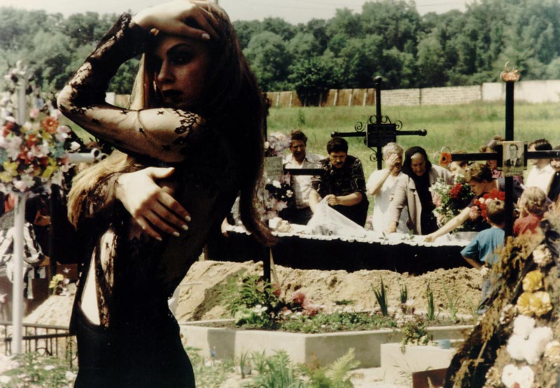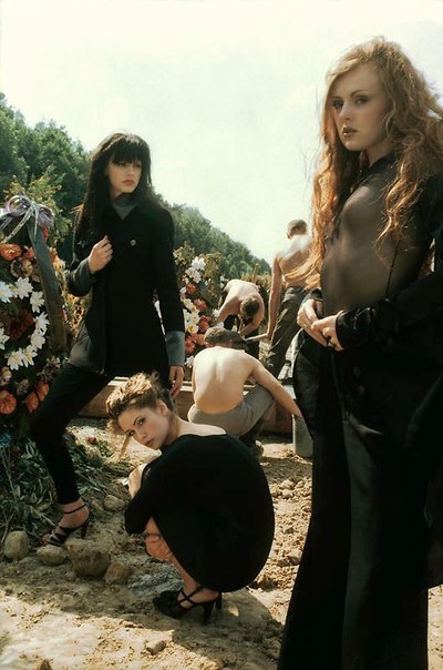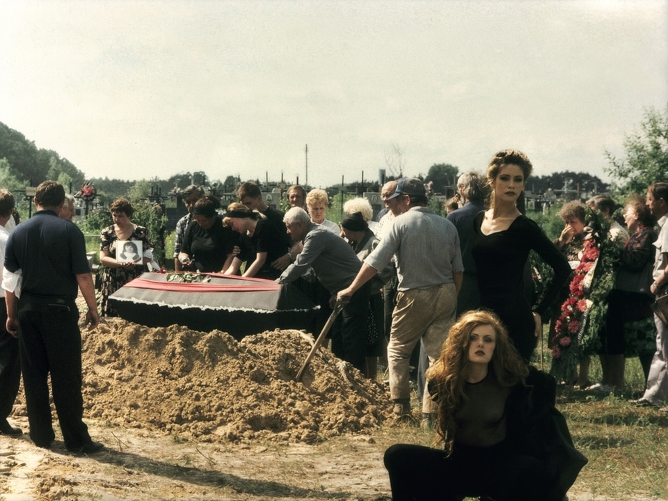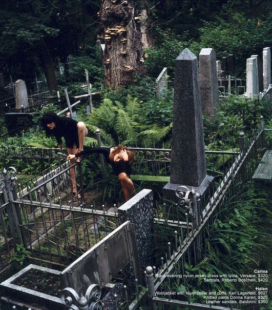 Щодо «Моди на цвинтарі», то даний проект є посиланням на фешн-фотографію. Спочатку він був опублікований в російському журналі про молодіжну культуру, «ОМ». Кожна продемонстрована річ, що вдягнена на моделі, коштує більше, ніж середня місячна заробітна плата пересічного громадянина в Україні в ті часи (наприклад, одного з тих, що стоїть позаду моделі на кладовищі). Цей, здавалося б, цинізм, демонструє дві паралельні реальності, натякаючи на соціальну напругу, за рахунок нової економічної системи в країні. Загалом, капіталізація похорону і смерті дивовижна річ – похорони продаються і купуються, як і модні луки. Невипадково Бодрійяр називає тіло «кладовищем знаків», порівнює труп, тіло моделі, робота, манекена. В його розумінні «мода — по ту сторону рационального и иррационального, прекрасного и безобразного, полезного и бесполезного; и вот эта ее во всех отношениях имморальность, легковесность порой сообщает ей (в обществах тоталитарных, пуританских)[1].»