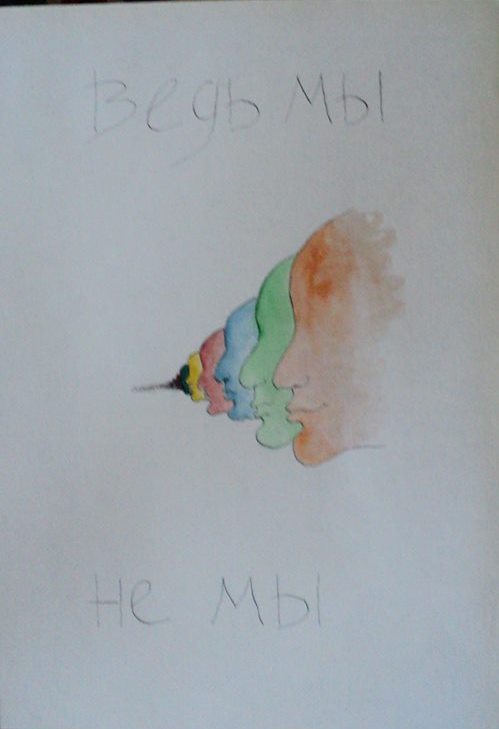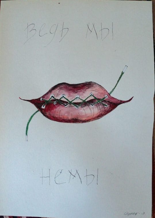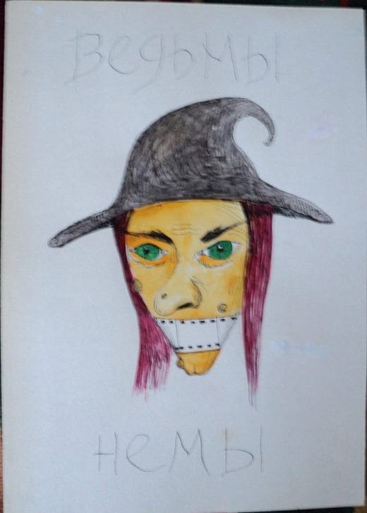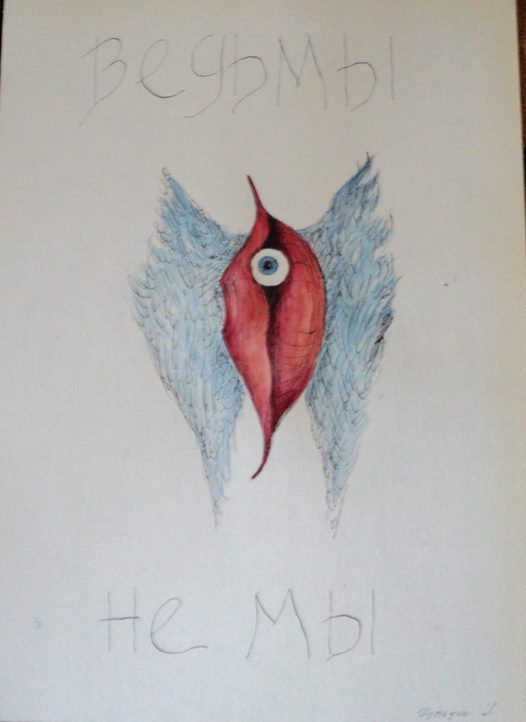 Робота «Відьми немі — Адже ми не ми!» складається із чотирьох частин, у сюжетну основу якого закладено постмодерністську гру слів та зображень. Так, на першому полотні зображено голову відьми із заклеєним ротом. На полотні зроблено напис російською мовою: «Ведьмы немы». На другому полотні намальовано сім різнокольорових профілів людей із написом «Ведь мы не мы». На третьому полотні зображено червоні губи, що тримають око та мають крила (символічно губи перетворюються на образ жіночої вагіни). Малюнок також супроводжується написом: «Ведьмы не мы». Четвертий малюнок також містить зображення губ, утім на цей раз вони зашиті ниткою. Напис на полотні: «Ведьмы немы».