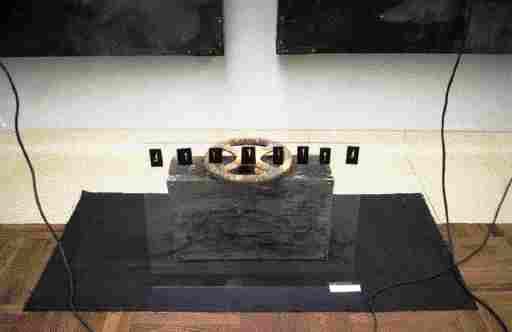 Дві з темно-сірими, майже чорними розводами фарби, підсвічені лампами. Під ними, на підлозі росташована конструкція, що нагадує сейф, перед ним – прозоре скло, на яке причіплені фотографії. Також був присутній звук.