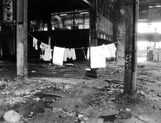 В корпусі покинутого заводу, на купі мотлоху стояло крісло. Між двома стовпами була закріплена мотузка, на якій висів різний одяг та малюнки.