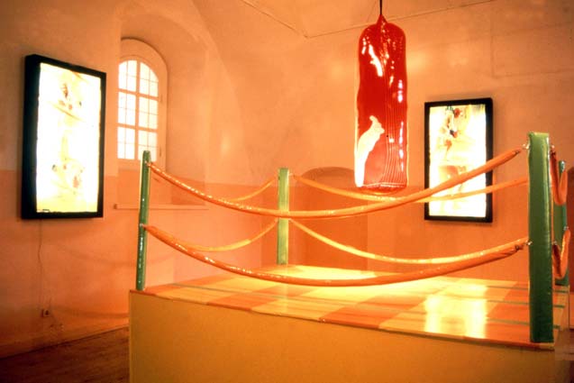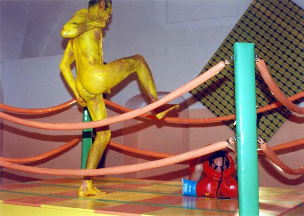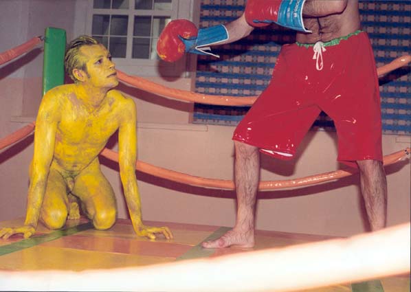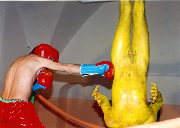 Інстальована документація перформансу “Побий мене на паперті” була представлена в рамках кураторського проекту Марти Кузьми “Симптоматична анонімність” (1997). В центрі сюжету – бій на справжньому рингу між двома боксерами, що уособлюють образи критика та художника. В ролі останнього виступив сам Чичкан, оголений та викрашений жовтою фарбою. Проект був доповнений інсталяцією з абстрактних картин, яка розміщувалася на підлозі, недалеко від лайтбоксів з фотохронікою перформансу і реді-мейд об’єктом-рингом, на якому він відбувався.