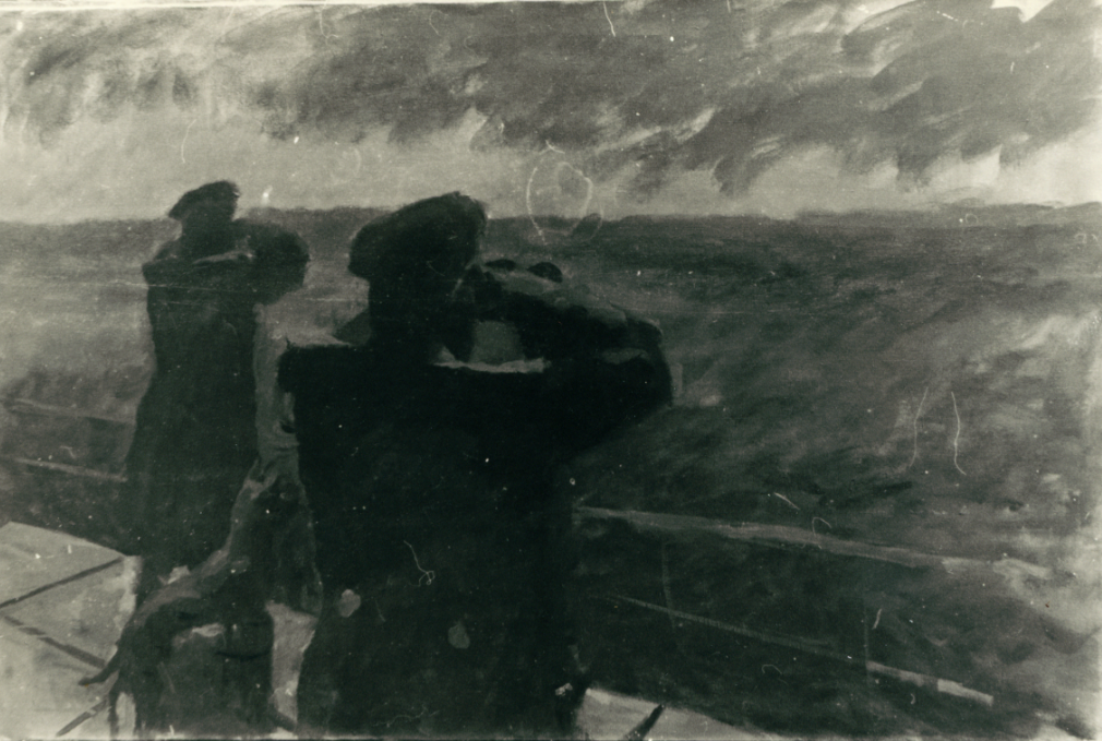 На тлі буряного морського пейзажу зображено двох чоловіків, котрі в біноклі дивляться в далечінь. Вони стоять спинами до глядача, так що ззаду видно ґудзики на хлястиках їхніх пальт, схожих на військові шинелі. Імовірно, це радянські морські офіцери на Чорному морі. Один чоловік стоїть ближче до центру, другий далі збоку. Між чоловіками виглядає собака, який теж дивиться на море. Фігури трохи зміщено від оптичного центру картини ліворуч, що створює драматичну і напружену атмосферу очікування.